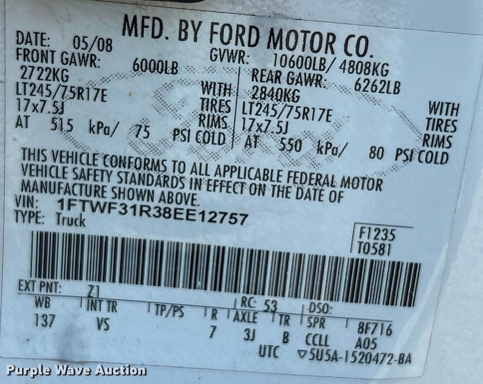 Purple Wave is selling a used 3/4 or 1 Ton Pickup or Van in Missouri. This item is a 2008 Ford F350 Super Duty XL pickup truck with the following: Miles: 75,909 on odometer, VIN: 1FTWF31R38EE12757