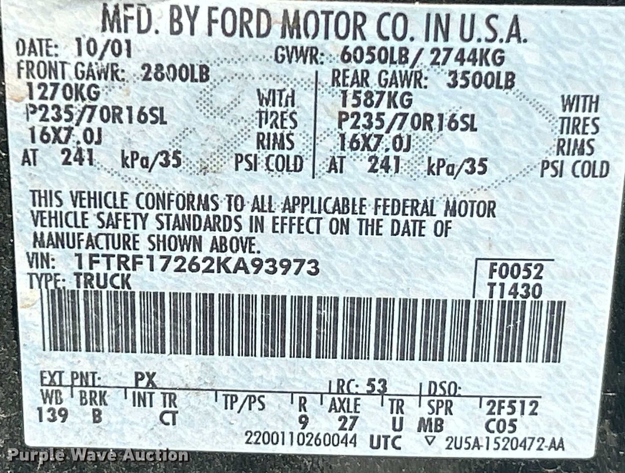 Purple Wave is selling a used 1/2 Ton Pickup or Van in Missouri. This item is a 2002 Ford F150 XL pickup truck with the following: Miles: Unknown, VIN: 1FTRF17262KA93973