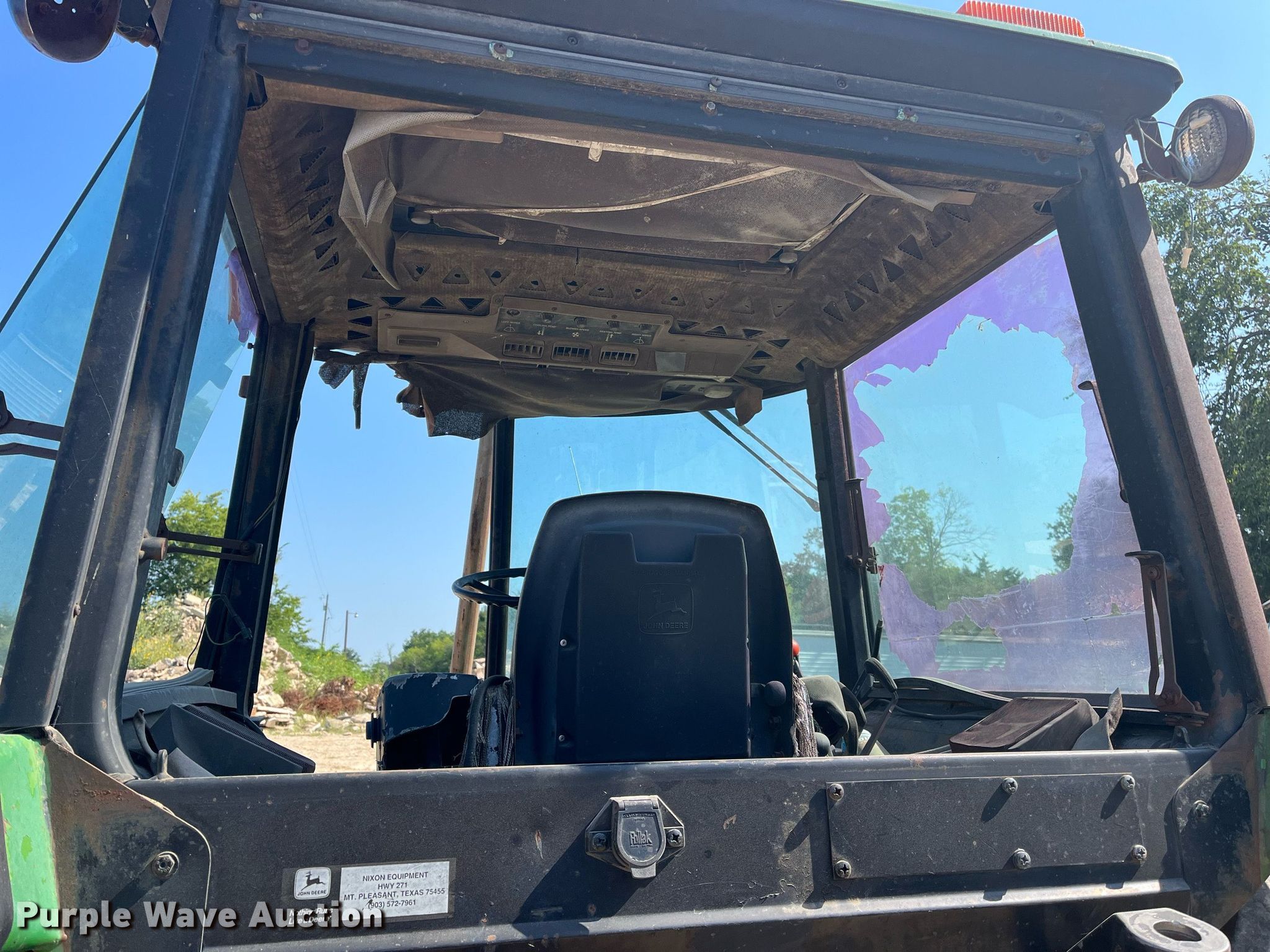 1984 John Deere 2550 tractor. Hours: 3,126 on meter, Serial: 527334L. Engine John Deere, Cylinders: 4, Fuel type: Diesel. Transmission Synchro, 8F - 4R. Operators station AC, Heat. Features PTO: 540, Three point, Seven pin outlet, Hydraulic remote sets Rear: 2. Tires Front: 255/70R16, Rear: 16.9-30. Notes Glass cracked, Door missing, Glass missing, Non-operational AC. Tri County. 496 County Rd SW 3110. Mount Vernon, TX 75457
