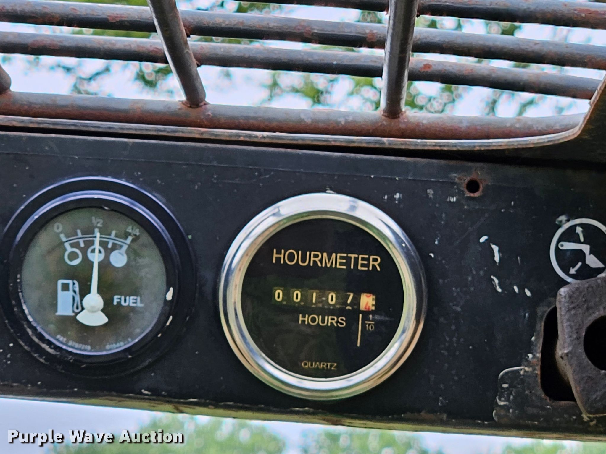 John Deere 90 skid steer loader. Hours: 107 on meter, Serial: 095972M. Engine Onan, Cylinders: 2, Fuel type: Gas. Transmission Hydrostatic. Operators station OROPS, Bucket control: Hand. Features Bucket John Deere, Width: 52", Teeth: Bolt-on. Tires Size: 27x8.50-15, Brand: Samson. Notes Non-operational hour meter. Tecumseh, KS 66542