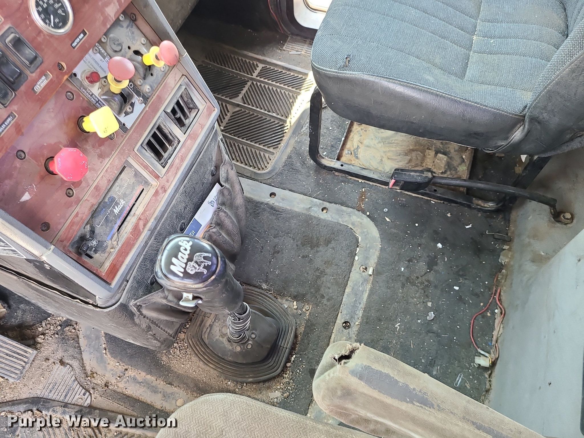 1999 Mack CL713 semi truck. Miles: 597,766 on odometer, Hours: 31,897 on meter, VIN: 1M1AD62Y5XW008908. Engine Mack, Displacement: 12.0L, Cylinders: 6, Fuel type: Diesel, Engine brake. Transmission Manual. Chassis Axles: Triple, Pusher axle, Suspension: Air, Brakes: Air, PTO, Wet kit. Interior AC, Heat, Cruise control. Features Deck plate: Aluminum, Fifth wheel type: Sliding, Fuel tank: Dual. Tires Size: 11R24.5, Lift axle: 295/75R22.5. Missouri title. Title distribution may be delayed up to 14 days from verification of funds. Shedigs It LLC. 610 North Prospect Avenue. Kansas City, MO 64120