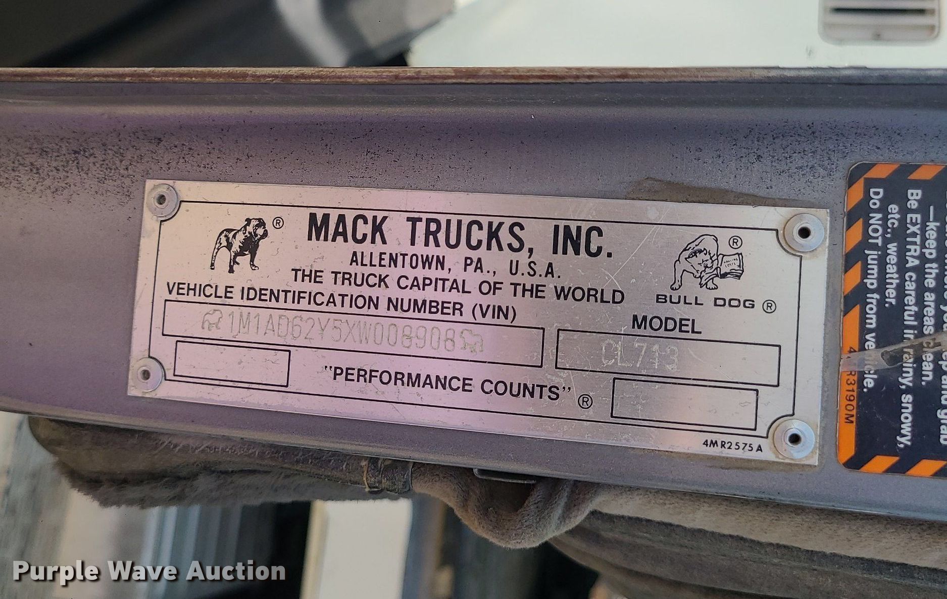 Purple Wave is selling a used Truck Tractor in Missouri. This item is a 1999 Mack CL713 semi truck with the following: Miles: 597,766 on odometer, Hours: 31,897 on meter, VIN: 1M1AD62Y5XW008908