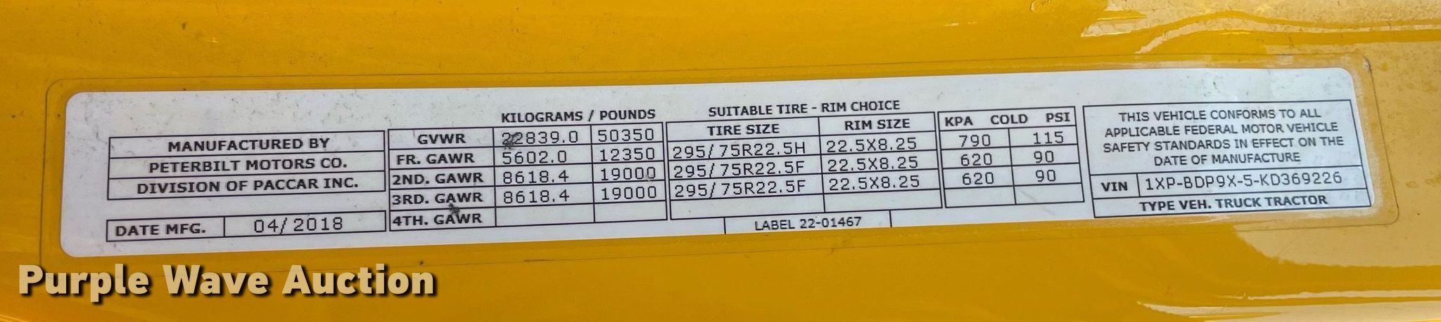 Purple Wave is selling a used Truck Tractor in Virginia. This item is a 2019 Peterbilt 579 semi truck with the following: Miles: 465,483 on odometer, Hours: 3,911 on meter, VIN: 1XPBDP9X5KD369226, Unit #: 1874