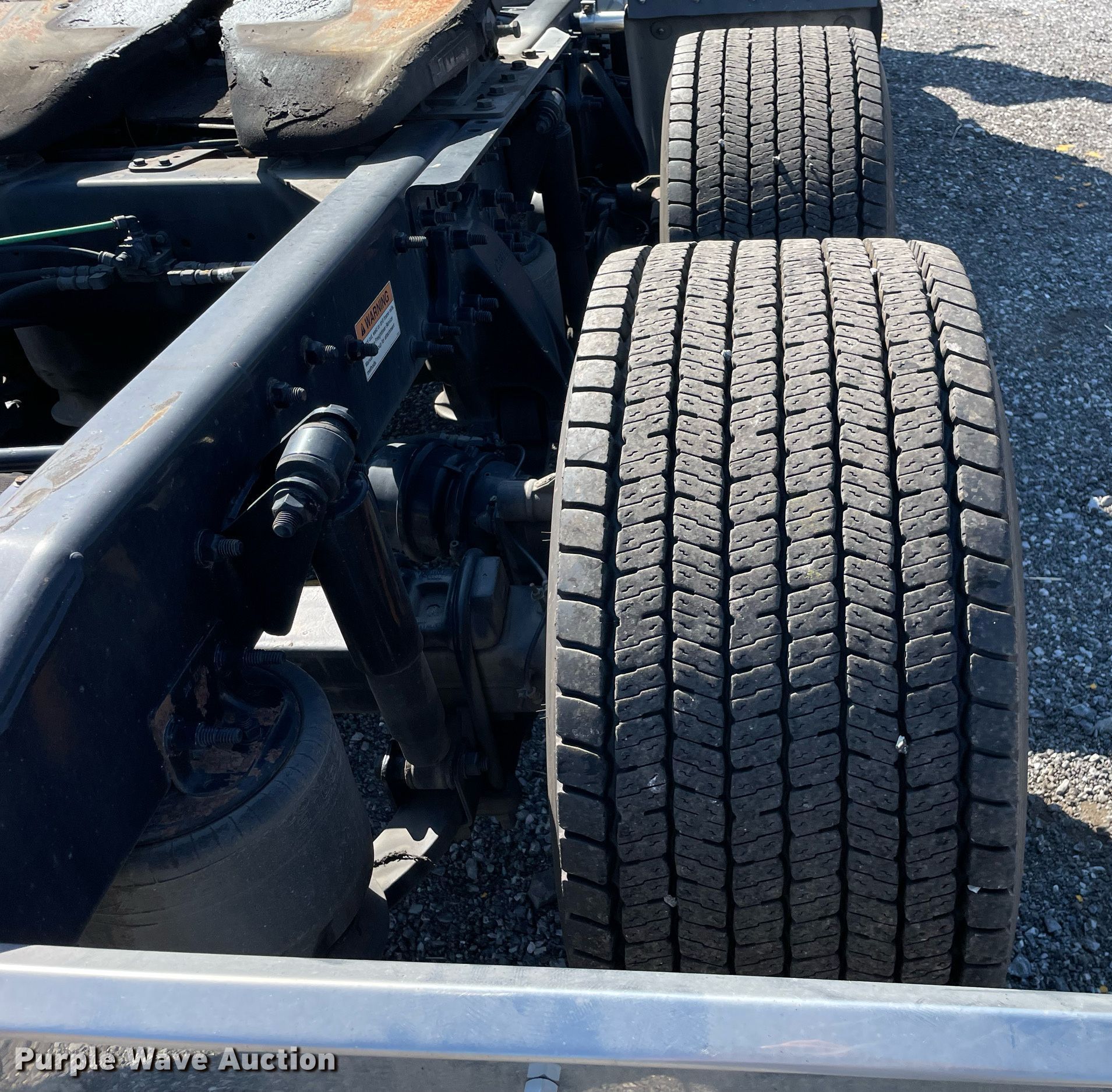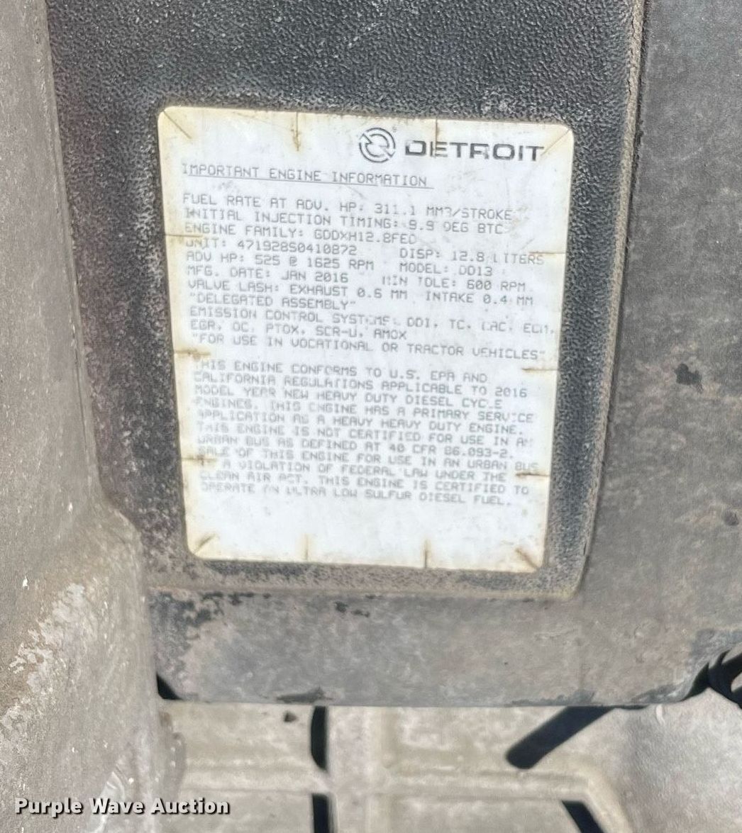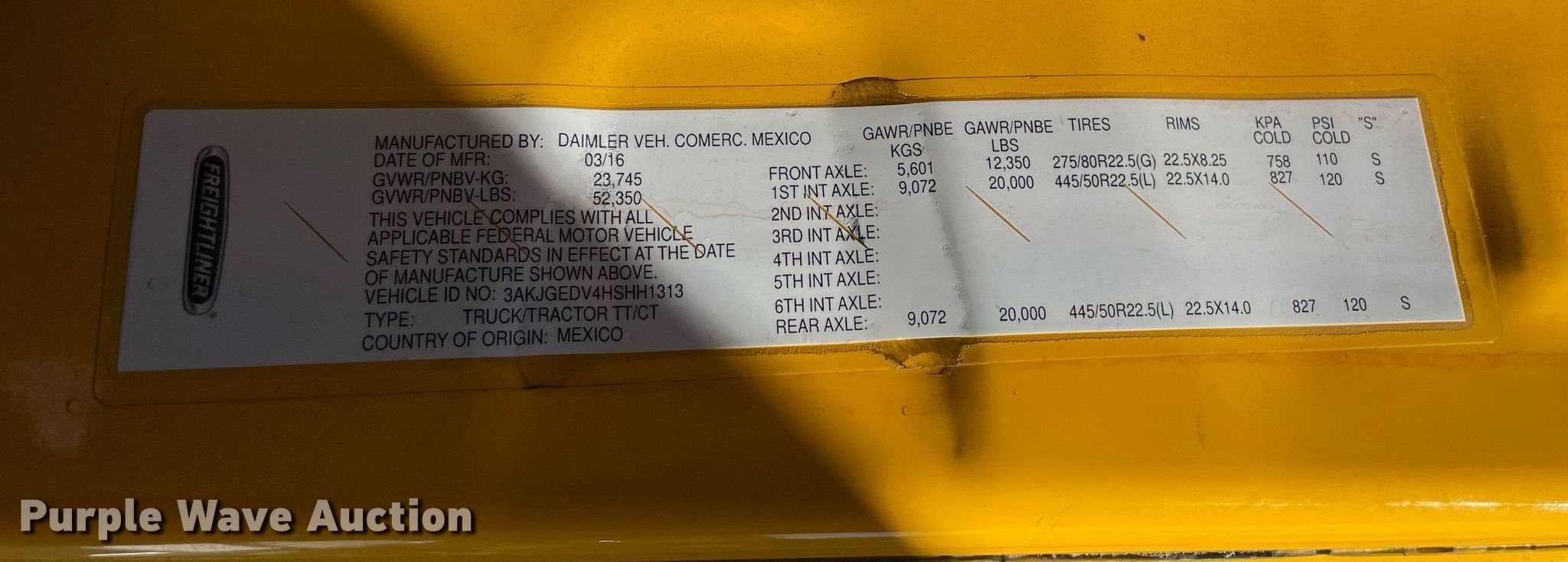 2017 Freightliner Cascadia 125 semi truck. Miles: 798,555 on odometer, Hours: 16,529 on meter, VIN: 3AKJGEDV4HSHH1313, Unit #: 1416. Engine Detroit Diesel DD13, Displacement: 12.8L, Cylinders: 6, Fuel type: Diesel, Engine brake. Transmission Automated manual. Chassis Axles: Tandem, Differential lock: Inter-axle, Suspension: Air Dump valves, Brakes: Air, GVWR: 52,350 lbs FAWR: 12,350 lbs, IAWR: 20,000 lbs, RAWR: 20,000 lbs. Interior AC, Heat, Heated mirrors, Power windows, Power locks, Cruise control, Air ride cab. Features Fifth wheel type: Fixed, Fuel tank: Single. Tires Front: 295/75R22.5, Rear: 445/50R22.5. Notes Windshield chipped or cracked. Oklahoma title. Title distribution may be delayed up to 30 days from verification of funds. Gemini Motor Transport. 4333 East Lee Highway. Max Meadows, VA 24360