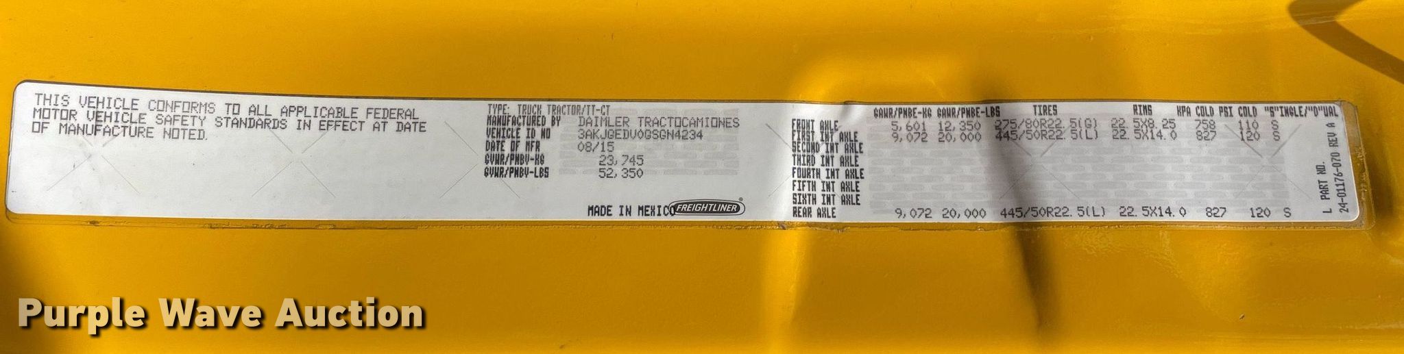 Purple Wave is selling a used Truck Tractor in Virginia. This item is a 2016 Freightliner Cascadia 125 semi truck with the following: Miles: 519,409 on odometer, Hours: 11,314 on meter, VIN: 3AKJGEDV0GSGN4234, Unit #: 1396