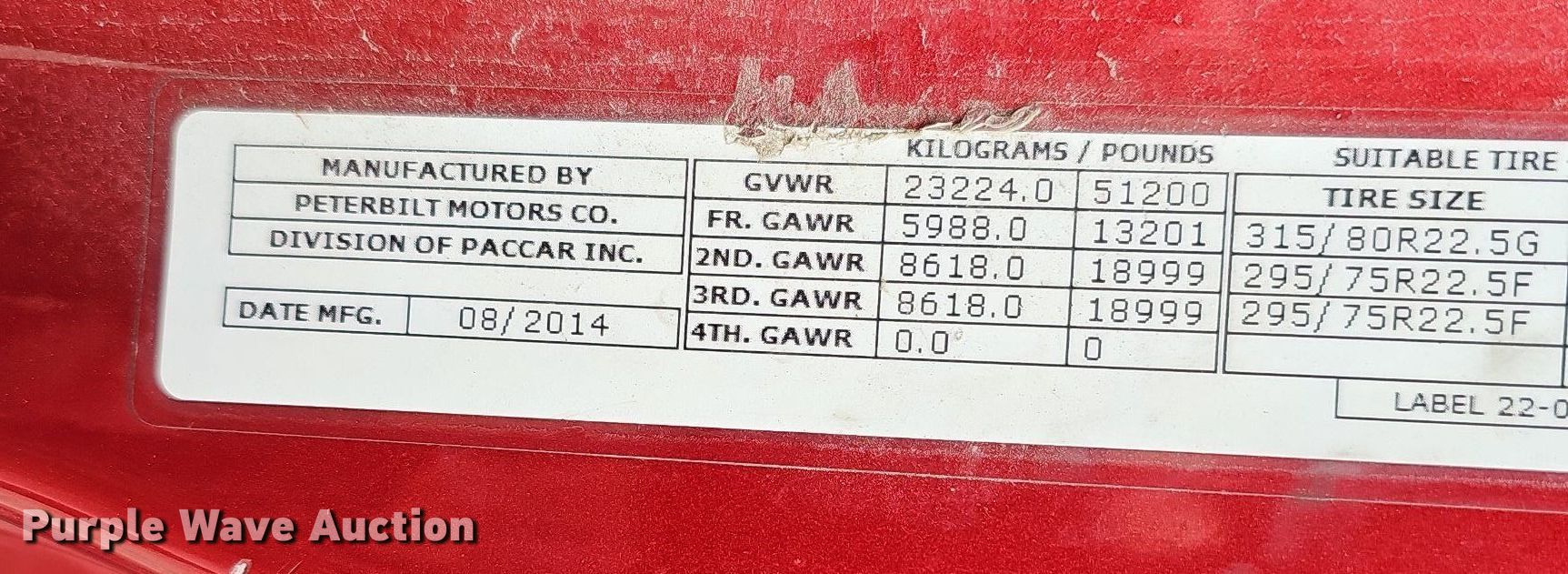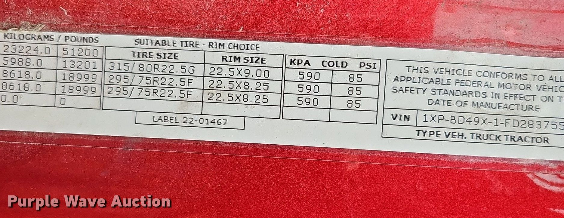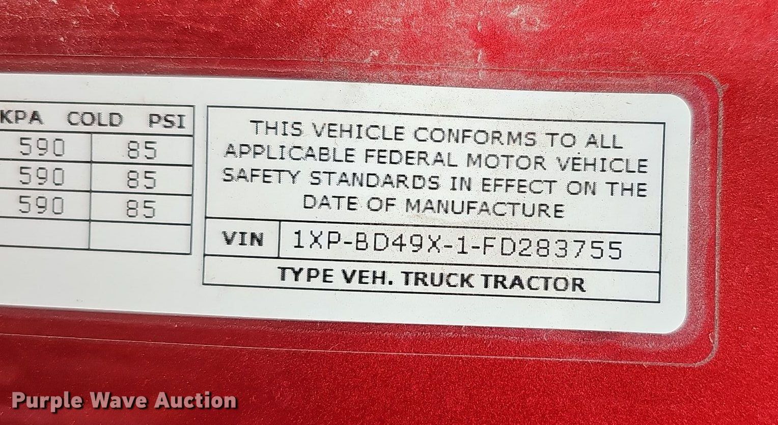 2015 Peterbilt 579 semi truck. Miles: 927,805 on odometer, VIN: 1XPBD49X1FD283755. Engine Cummins, Displacement: 14.9L, Cylinders: 6, Fuel type: Diesel, Engine brake. Transmission Eaton Fuller, Manual, Speed: 10. Chassis Axles: Tandem, Differential lock: Inter-axle, Suspension: Air Dump valves, Brakes: Air, GVWR: 51,200 lbs FAWR: 13,201 lbs, IAWR: 18,999 lbs, RAWR: 18,999 lbs, Wheelbase: 258". Interior AC, Heat, Cruise control, Air ride cab, Sleeper Sleeper length: 60", Beds: Single, Rear climate control. Features Deck plate: Aluminum, Fifth wheel type: Air operated, Sliding, Fuel tank: Dual, Sturdi-Lite headache rack. Tires Size: 295/75R22.5. Notes No keys, Unknown operating condition. Nebraska title. Title distribution may be delayed up to 14 days from verification of funds. LTA Towing LLC. 904 Giltner Spur. Aurora, NE 68818