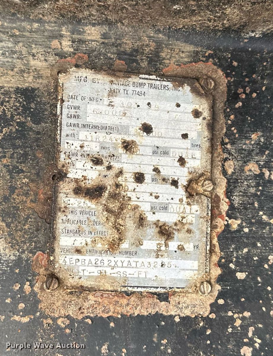 Purple Wave is selling a used End Dump Rock Trailer in Kansas. This item is a 2000 Vantage end dump trailer with the following: VIN: 4EPBA262XYATA3225