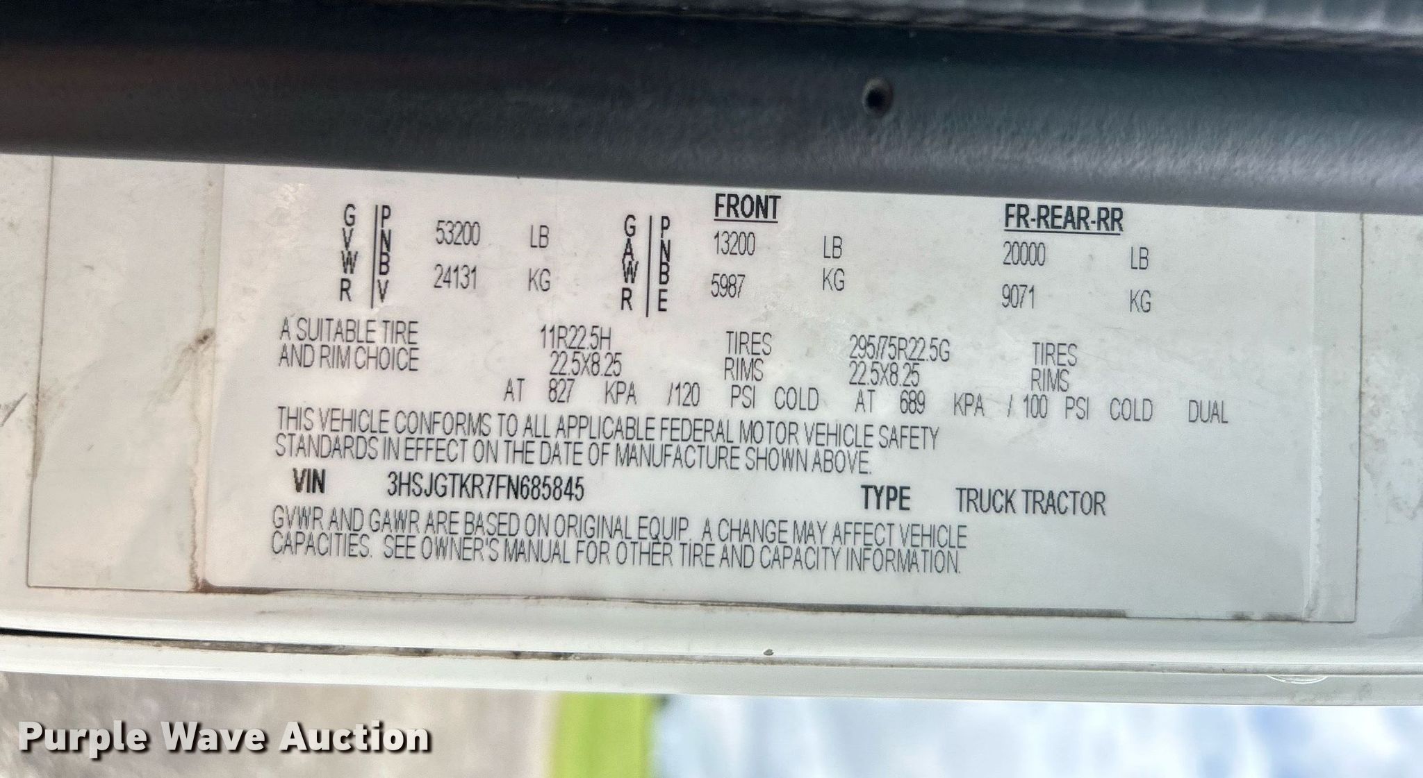 2015 Caterpillar CT660 semi truck. Miles: 453,579 on odometer, Hours: 11,438 on meter, VIN: 3HSJGTKR7FN685845. Engine Caterpillar CT13, Displacement: 13.0L, Cylinders: 6, Fuel type: Diesel. Transmission Eaton Fuller, Manual, Speed: 10. Chassis Axles: Tandem, Differential lock: Inter-axle, Suspension: Air Dump valves, Brakes: Air, GVWR: 53,200 lbs FAWR: 13,200 lbs, IAWR: 20,000 lbs, RAWR: 20,000 lbs, Wheelbase: 179". Interior AC, Heat, Heated mirrors, Power windows, Power locks, Cruise control. Features Fifth wheel type: Air operated, Sliding, Fuel tank: Dual. Tires Size: 275.80R22.5. Notes Non-operational passenger door. Oklahoma title. Title distribution may be delayed up to 14 days from verification of funds. 15107 North 137th East Avenue. Collinsville, OK 74021