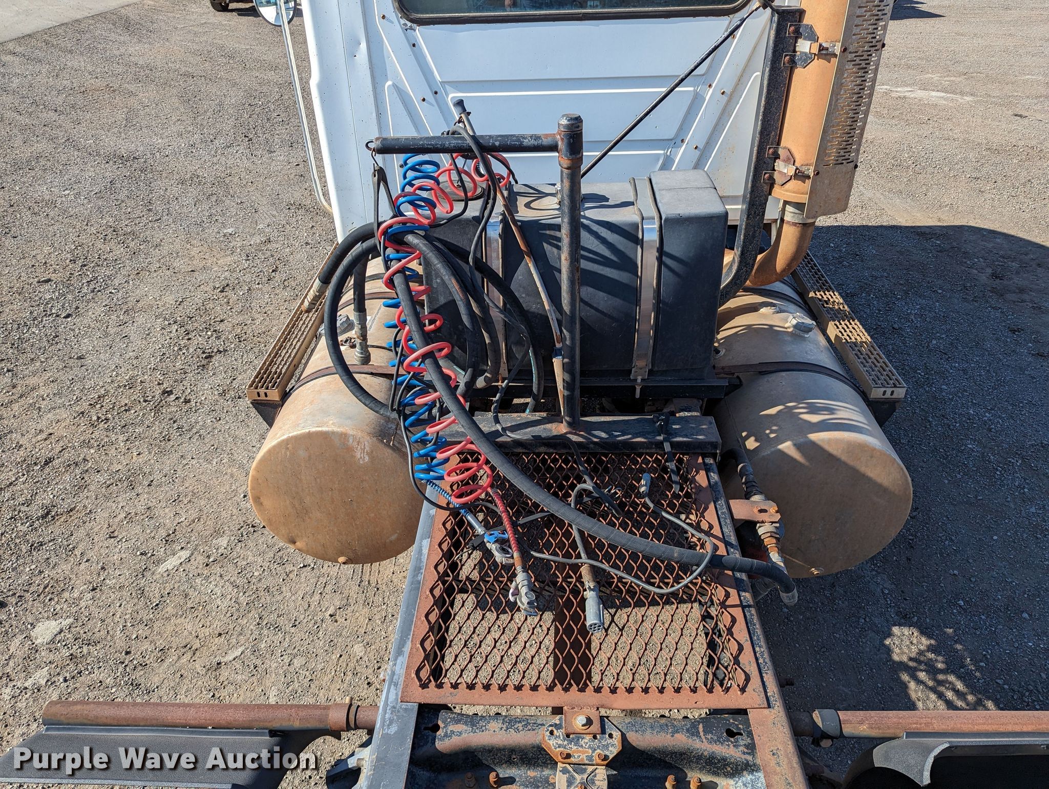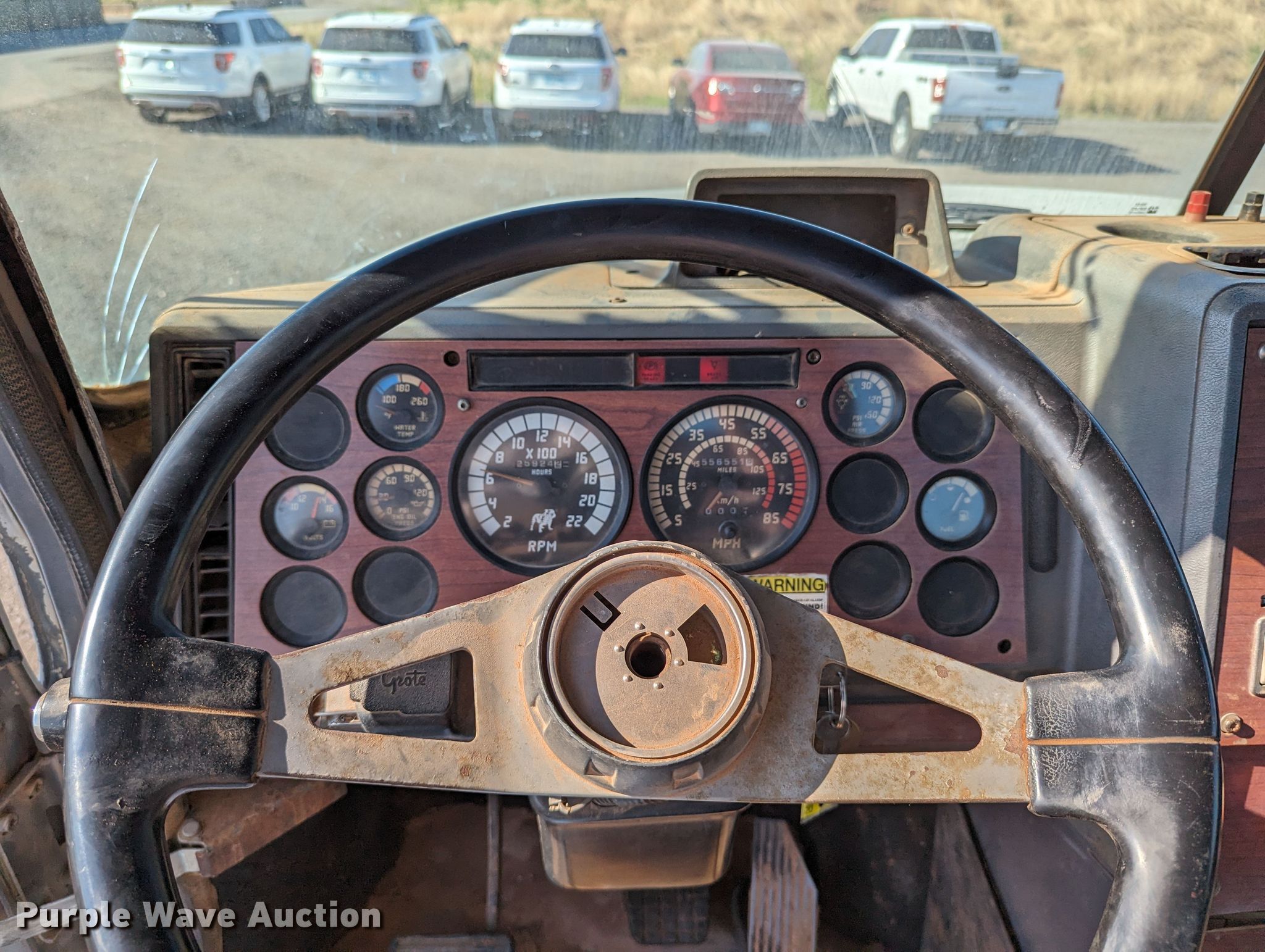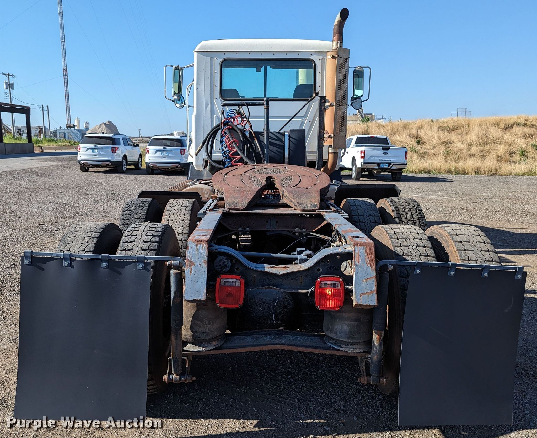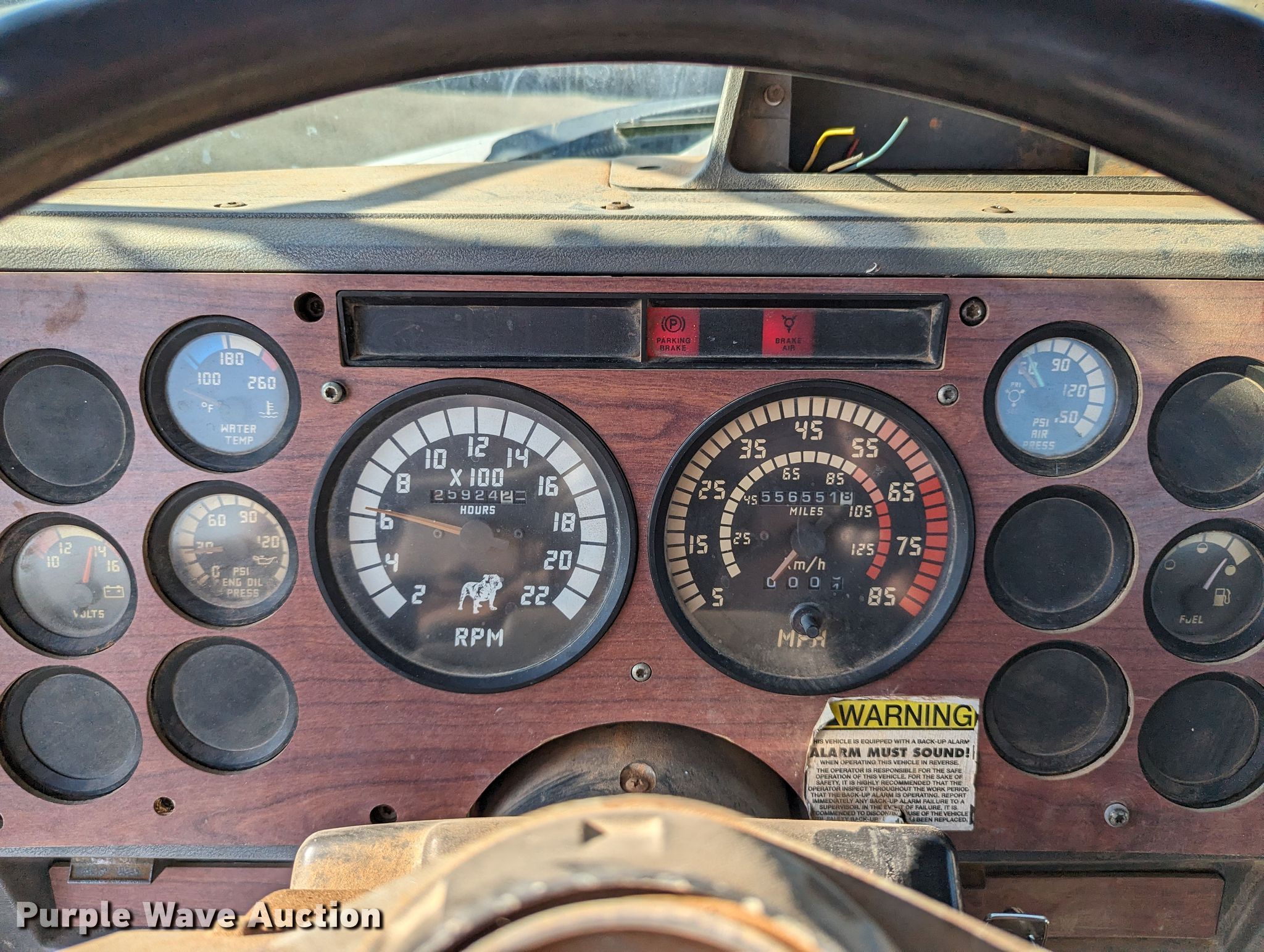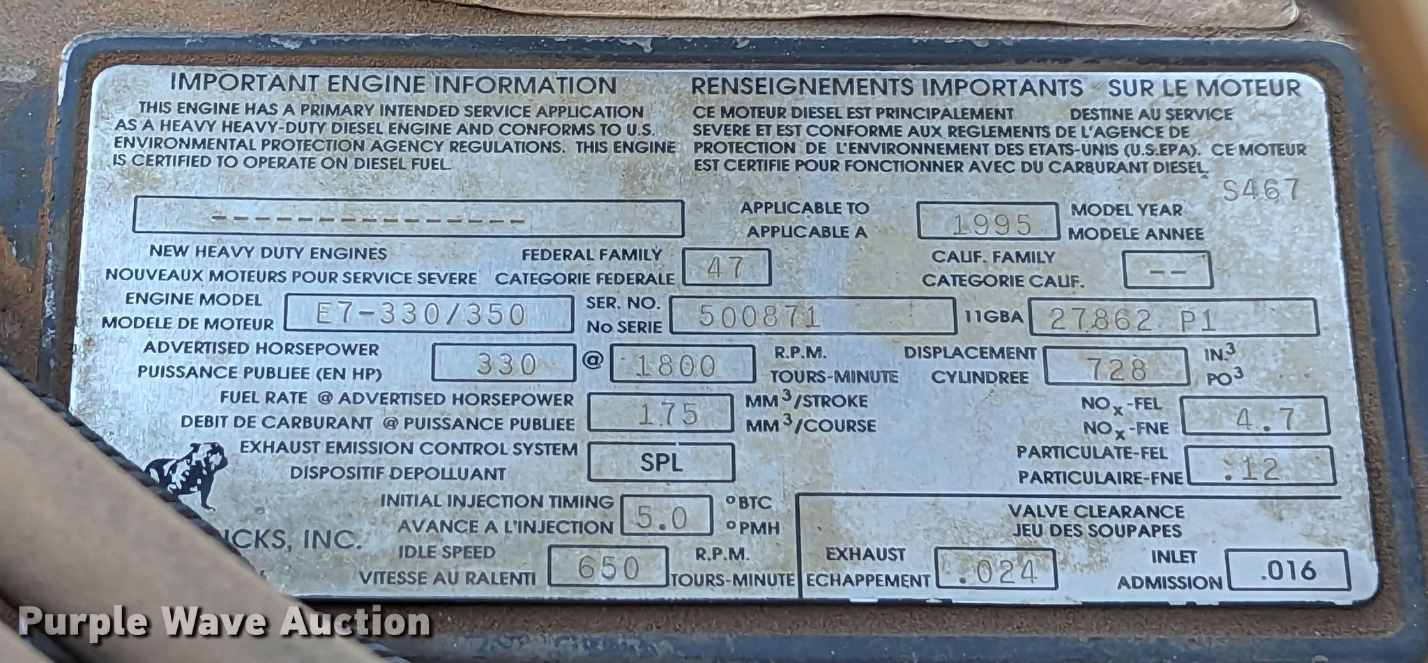 1996 Mack CH613 semi truck. Miles: 556,552 on odometer, Hours: 25,924 on meter, VIN: 1M1AA12Y5TW063073, Unit #: 801.220. Engine Mack E7-330/350, Serial: 500871, Displacement: 728 C.I.D., Cylinders: 6, Fuel type: Diesel. Transmission Manual. Chassis Axles: Tandem, Differential lock: Inter-axle, Suspension: Air Dump valves, Brakes: Air, PTO, Wet kit. Interior AC, Heat, Heated mirrors, Power passenger window, Cruise control. Features Deck plate: Steel, Fifth wheel type: Air operated, Sliding, Fuel tank: Dual. Tires Size: 295/75R22.5. Oklahoma classic title. Title distribution may be delayed up to 30 days from verification of funds. Duit Holdings Inc.. 7183 E Waterloo Industrial Rd. Edmond, OK 73034