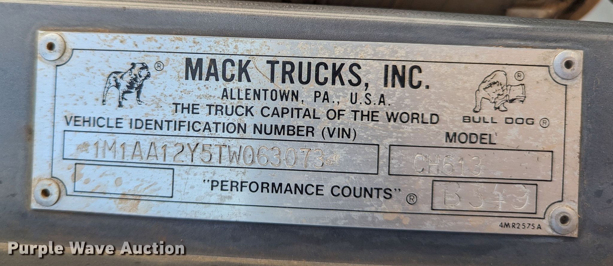 Purple Wave is selling a used Truck Tractor in Oklahoma. This item is a 1996 Mack CH613 semi truck with the following: Miles: 556,552 on odometer, Hours: 25,924 on meter, VIN: 1M1AA12Y5TW063073, Unit #: 801.220