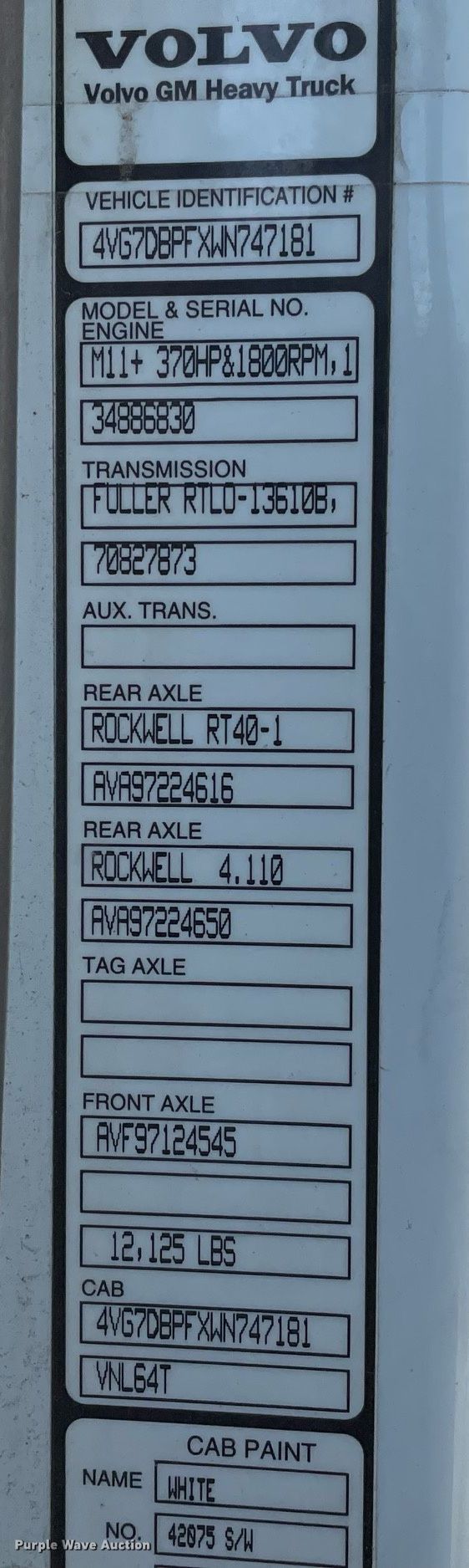 1998 Volvo VNL64T semi truck. Miles: 18,713 on odometer, VIN: 4VG7DBPFXWN747181. Engine Cummins M11 Plus, Displacement: 10.8L, Cylinders: 6, Fuel type: Diesel, Engine brake. Transmission Eaton Fuller, Manual, Speed: 10. Chassis Axles: Tandem, Differential lock: Inter-axle, Suspension: Air Dump valves, Brakes: Air, GVWR: 50,125 lbs FAWR: 12,125 lbs, IAWR: 19,000 lbs, RAWR: 19,000 lbs. Interior AC, Heat, Heated mirrors, Cruise control, Air ride cab. Features Deck plate: Aluminum, Fifth wheel type: Air operated, Sliding, Fuel tank: Dual. Tires Size: 12R22.5. Notes Trailer not included. Kansas title. Title distribution may be delayed up to 14 days from verification of funds. Lindsborg, KS 67456