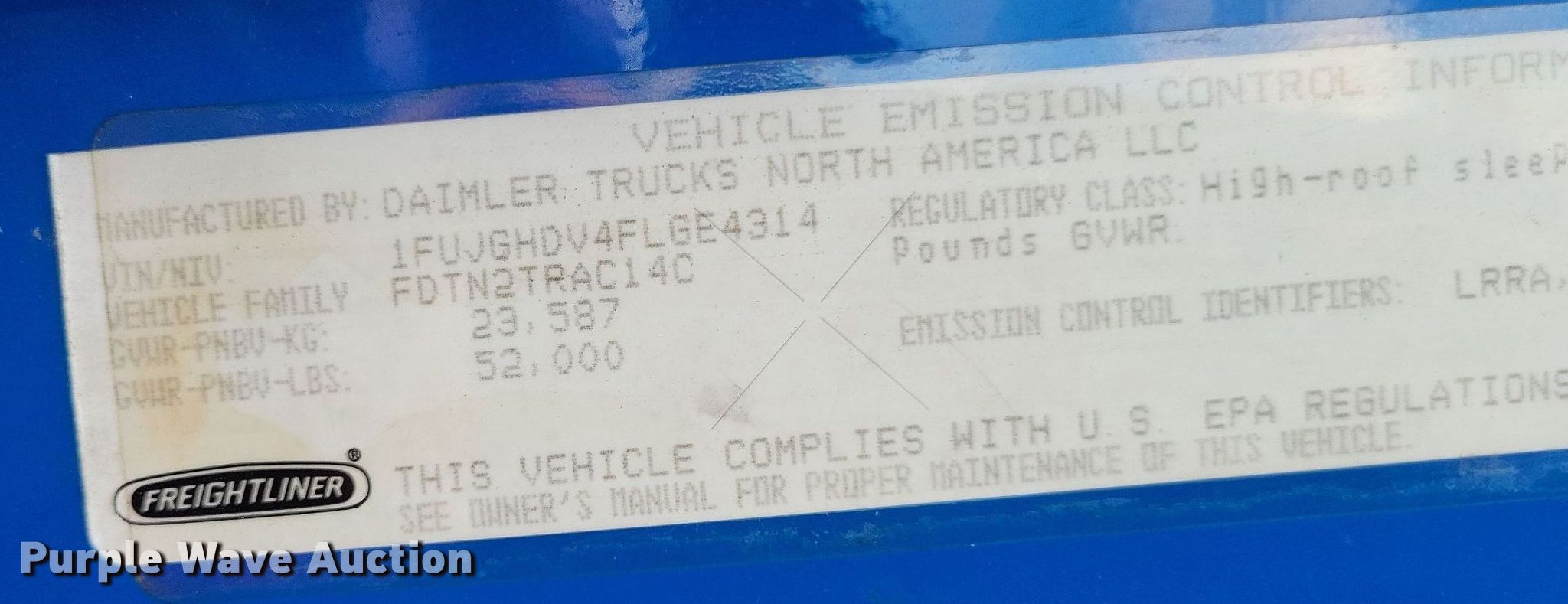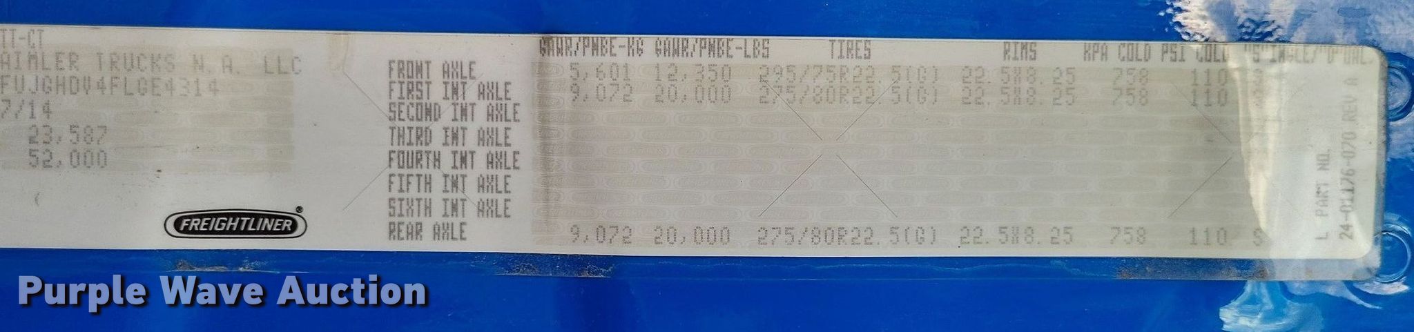 2015 Freightliner Cascadia 113 semi truck. Miles: 682,669 on odometer, Hours: 30,631 on meter, VIN: 1FUJGHDV4FLGE4314, Unit #: 835. Engine Detroit Diesel DD13, Displacement: 12.8L, Cylinders: 6, Fuel type: Diesel, Engine brake. Transmission Manual, Speed: 10. Chassis Axles: Tandem, Differential lock: Inter-axle, Suspension: Air Dump valves, Brakes: Air, GVWR: 52,000 lbs FAWR: 12,350 lbs, IAWR: 20,000 lbs, RAWR: 20,000 lbs. Interior AC, Heat, Heated mirrors, Power windows, Cruise control, Air ride cab, Sleeper Sleeper length: 5', Beds: Double bunk, Refrigerator, Rear climate control. Features Deck plate: Aluminum, Fifth wheel type: Fixed, Fuel tank: Single. Tires Size: 295/75R22.5. Notes Dead battery. Florida title. Title distribution may be delayed up to 30 days from verification of funds.. Sale conducted by order of secured party pursuant to section 9-610 of the Uniform Commercial Code as adopted, each respectively, in the state of Oklahoma and Florida. 2141 Northwest 141st Street. Opa-locka, FL 33054
