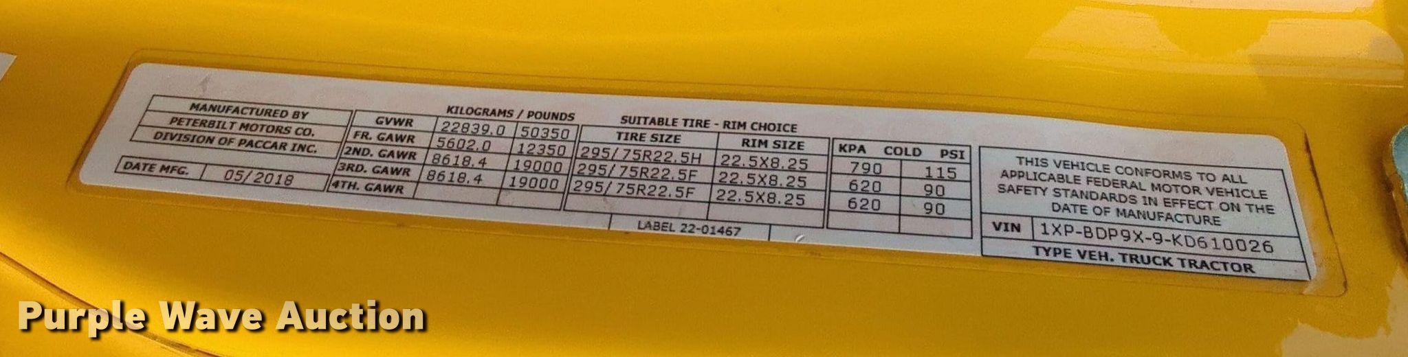 Purple Wave is selling a used Truck Tractor in Oklahoma. This item is a 2019 Peterbilt 579 semi truck with the following: Miles: 535,189 on odometer, Hours: 11,009 on meter, VIN: 1XPBDP9X9KD610026, Unit #: 1885