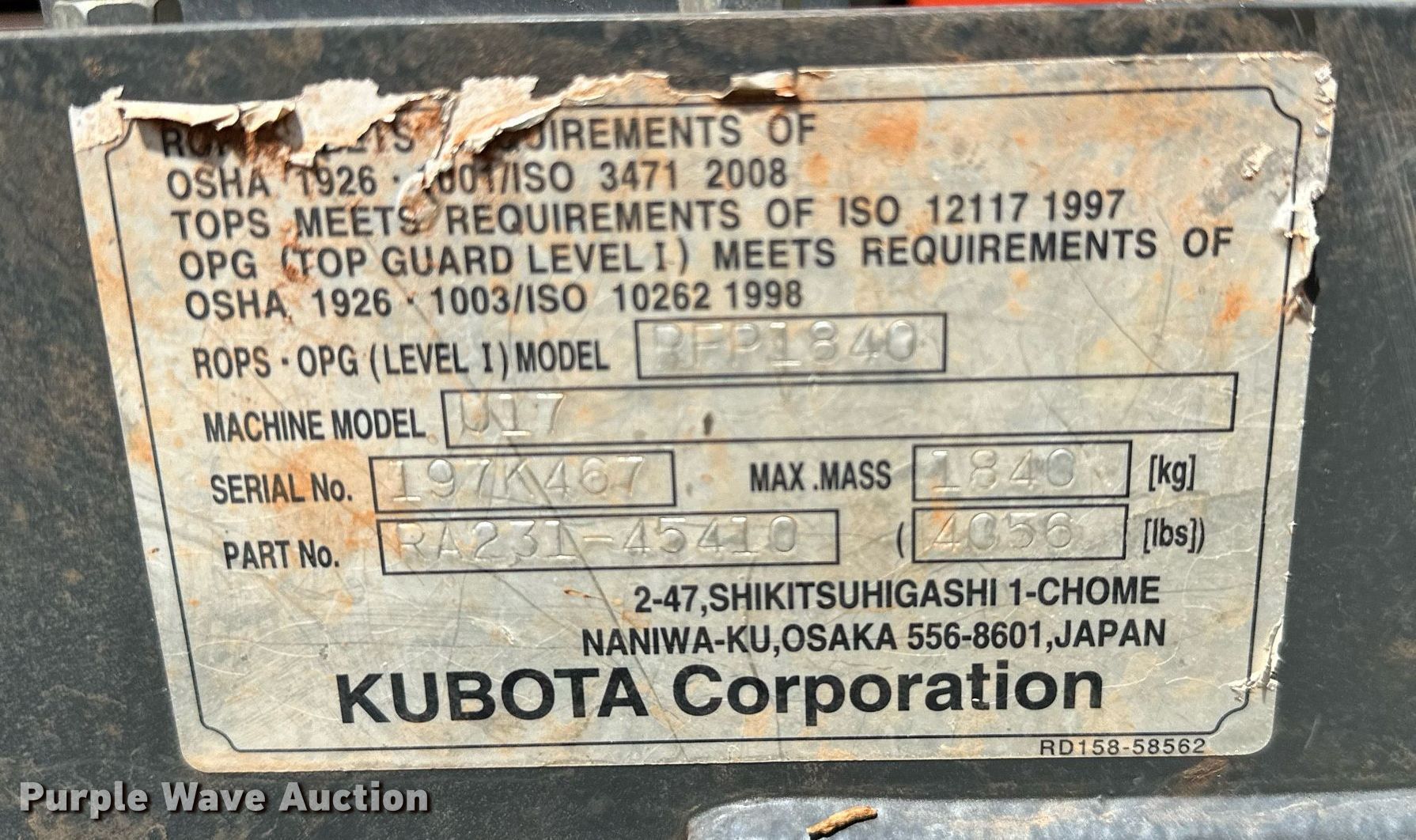 Purple Wave is selling a used Mini Excavator in Oklahoma. This item is a 2019 Kubota U17 mini excavator with the following: Hours: 702 on meter, Serial: KBCU0173CK3G49014