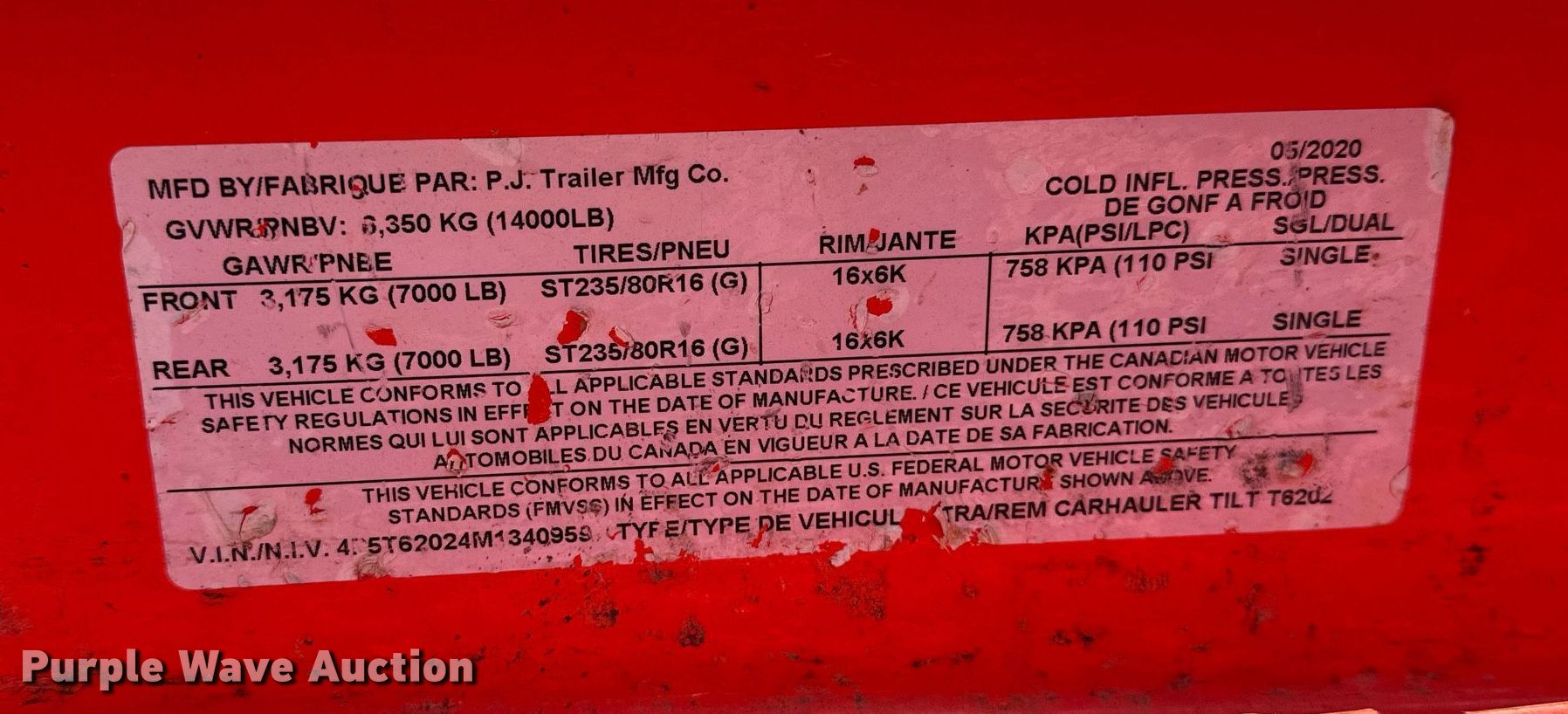 Purple Wave is selling a used Car or Utility Trailer in Oklahoma. This item is a 2021 PJ T6202 tilt deck utility trailer with the following: VIN: 4P5T62024M1340959, Unit #: 40959