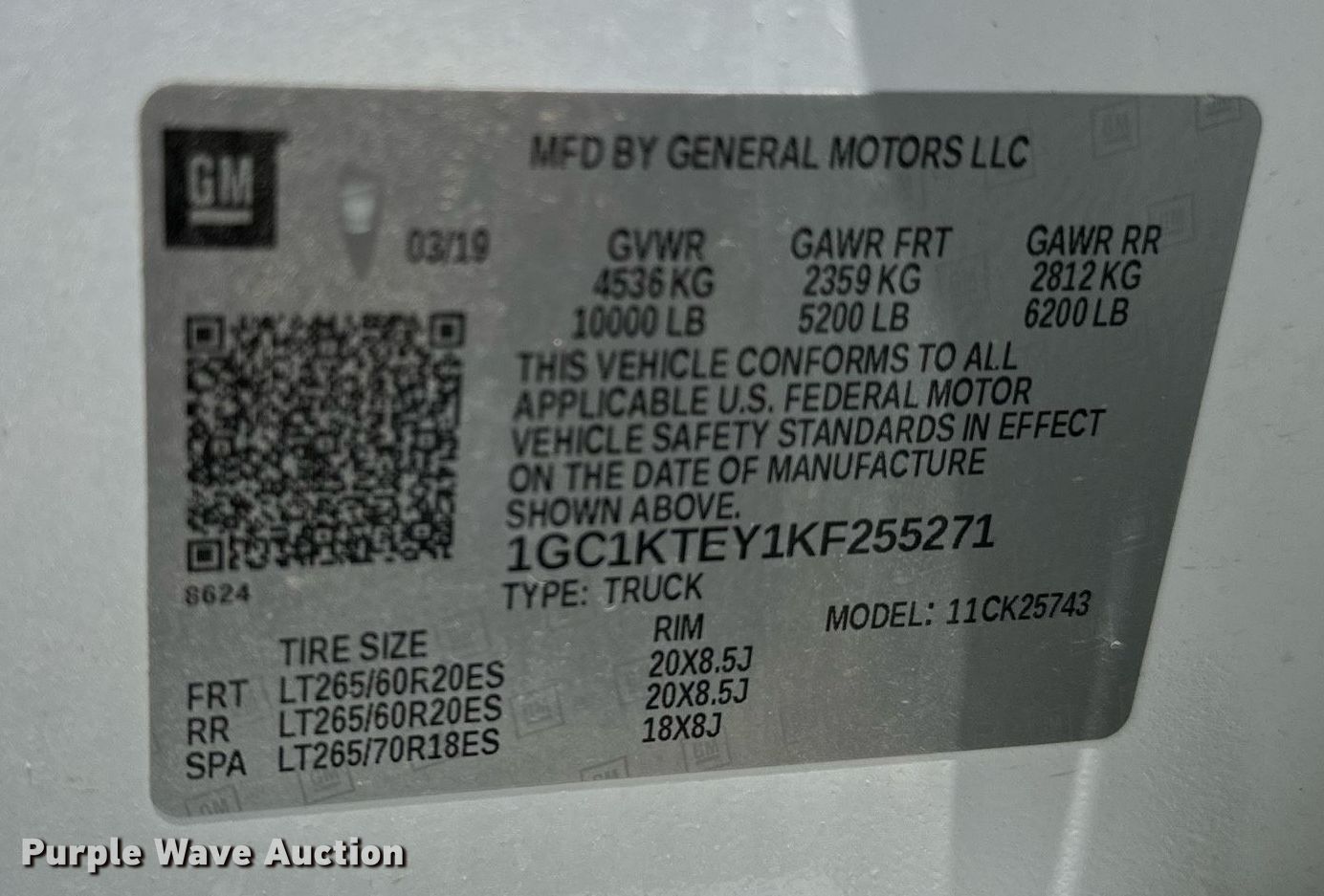 Purple Wave is selling a used 3/4 or 1 Ton Pickup or Van in Oklahoma. This item is a 2019 Chevrolet Silverado 2500HD Crew Cab pickup truck with the following: Miles: 113,304 on odometer, Miles or hours may vary, unit still in use, VIN: 1GC1KTEY1KF255271