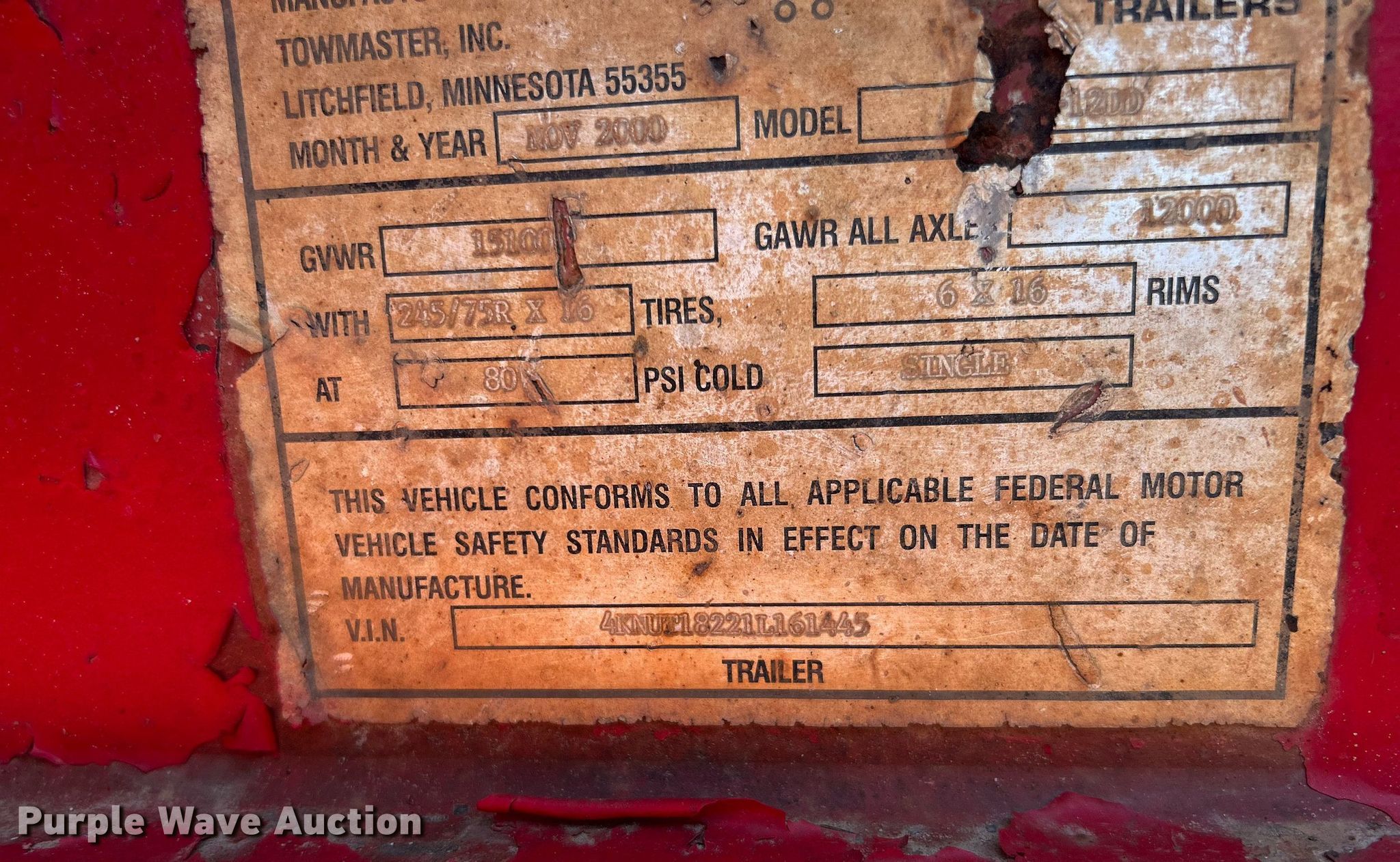 Purple Wave is selling a used Car or Utility Trailer in Oklahoma. This item is a 2001 Towmaster utility trailer with the following: VIN: 4KNUT18221L161445, Unit #: 14-256