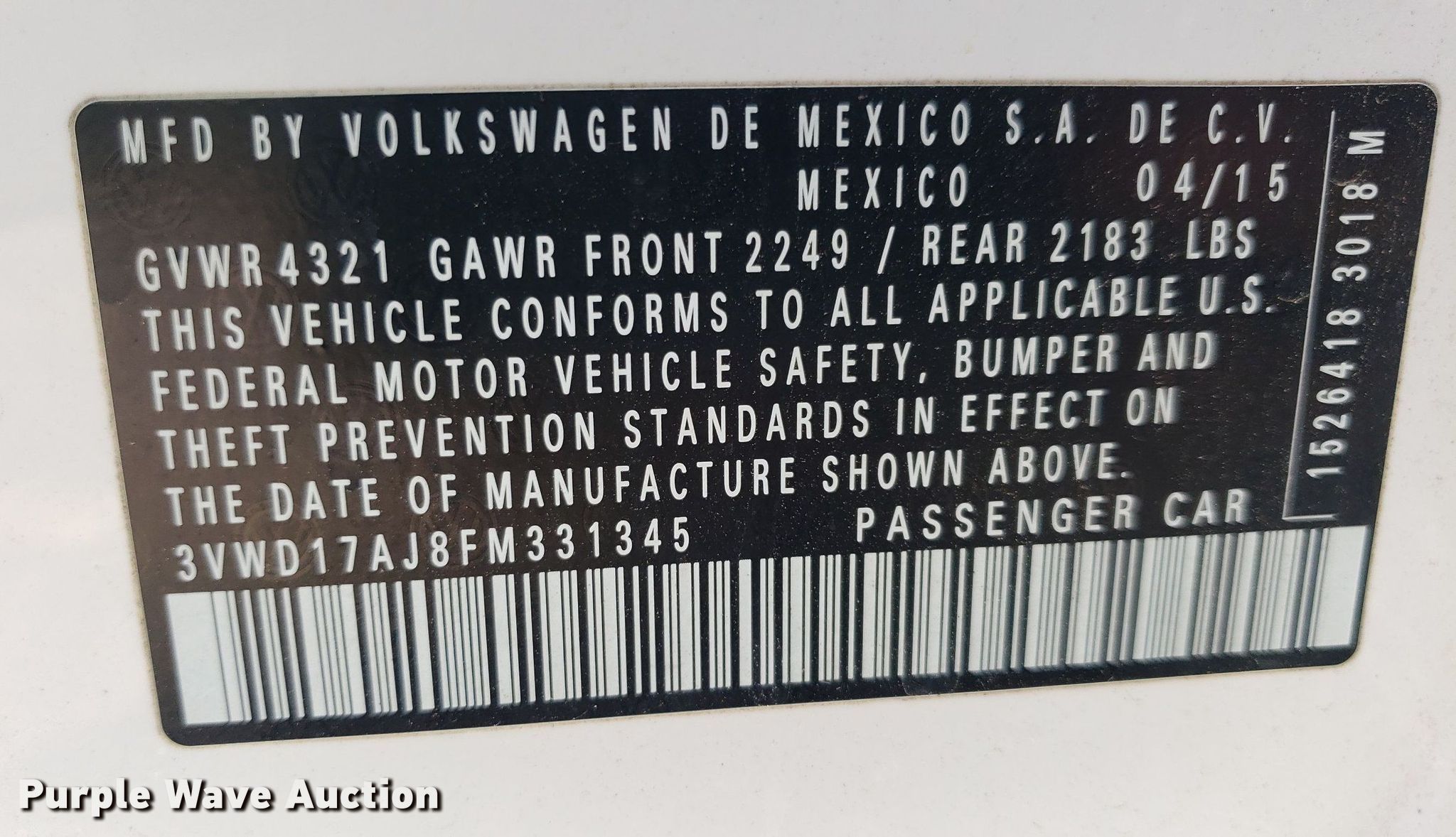 Purple Wave is selling a used Passenger Vehicle in Kansas. This item is a 2015 Volkswagen Jetta with the following: Miles: 130,823 on odometer, VIN: 3VWD17AJ8FM331345