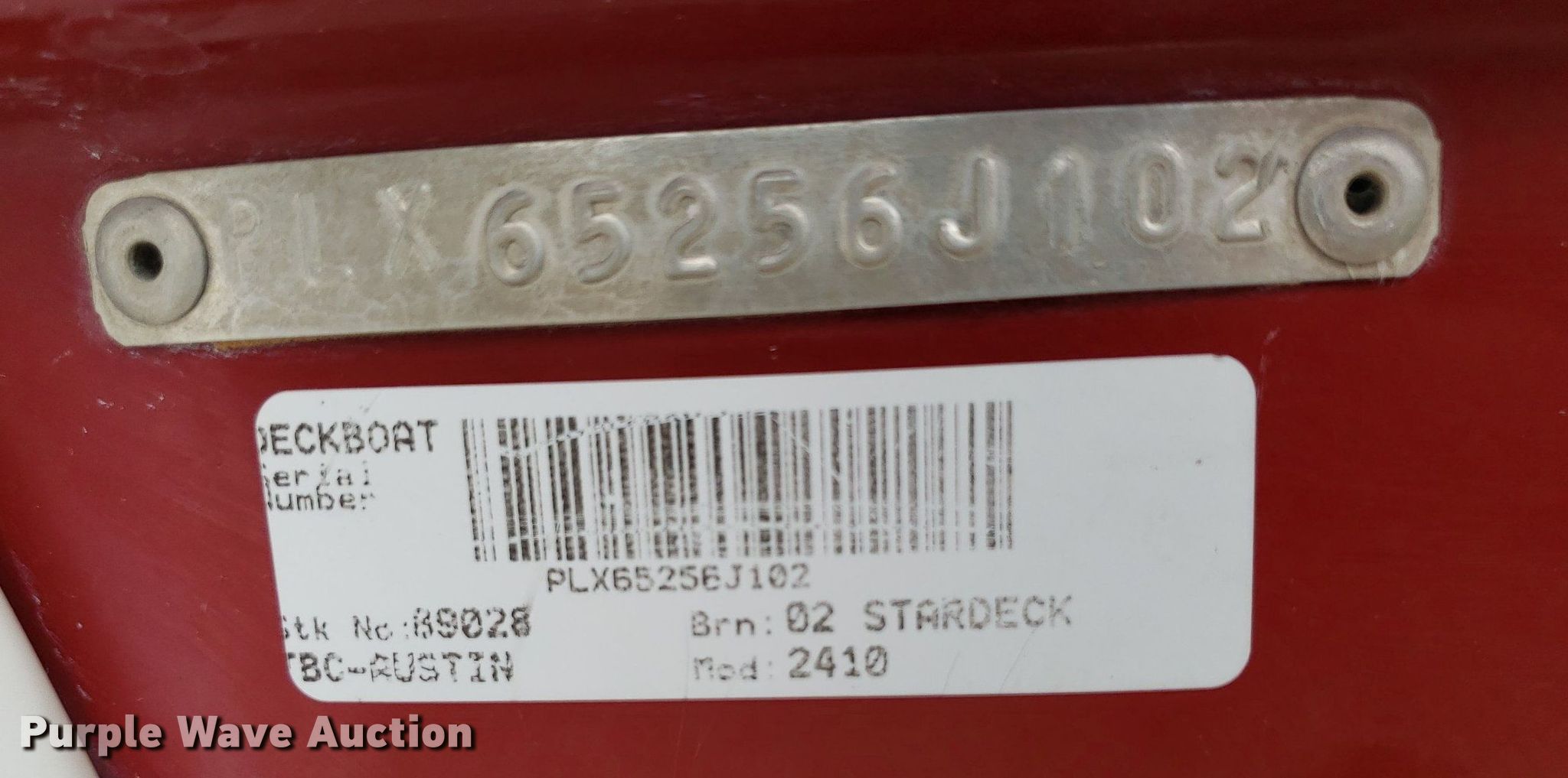 Purple Wave is selling a used Boat in Kansas. This item is a 2002 Starcraft Stardeck 2410 Travis Edition boat with the following: Length: 24', Hull ID: PLX65256J102, Unit #: KA386XH