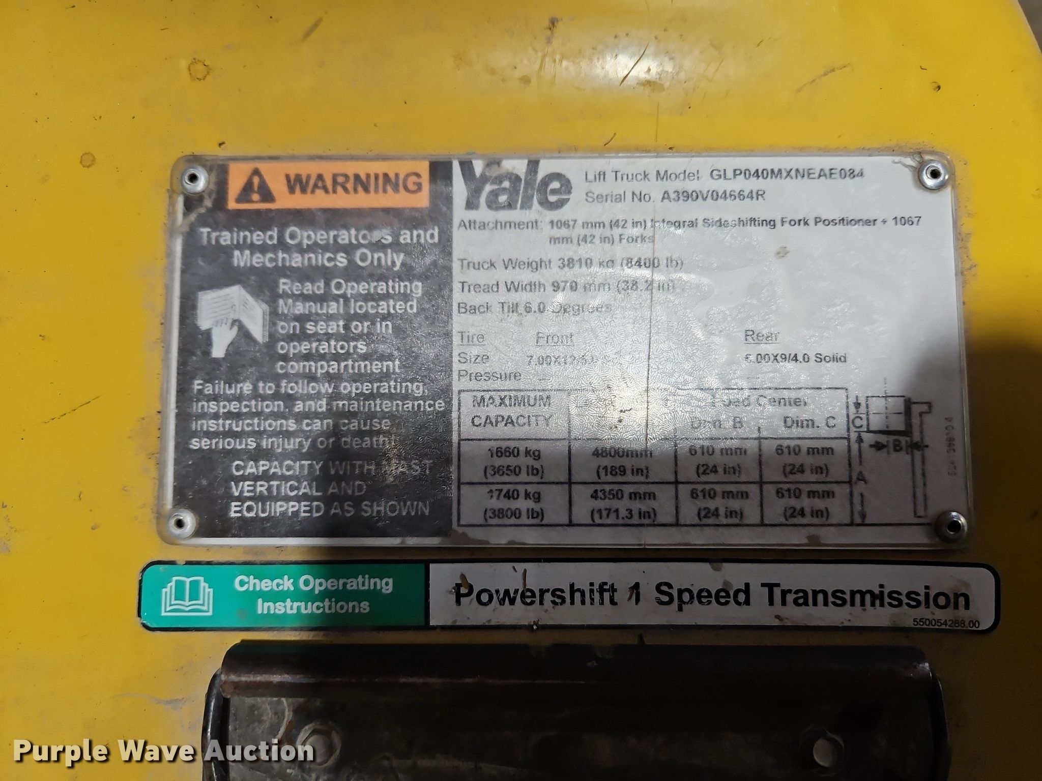 Purple Wave is selling a used Warehouse Forklift in Kansas. This item is a Yale GLP040MXNEAE084 forklift with the following: Hours: 3,969 on meter, Serial: A390V04664R