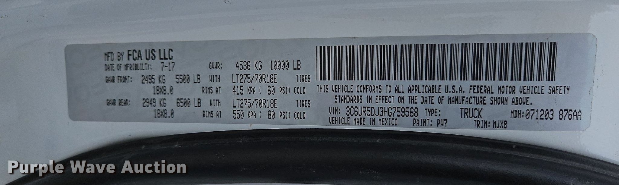 - VIN: 3C6UR5DJ3HG759568