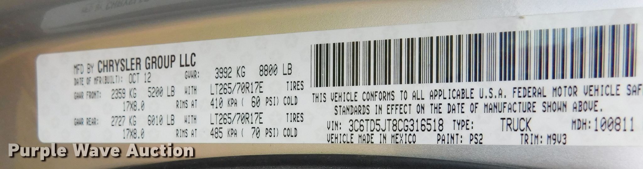 Purple Wave is selling a used 3/4 or 1 Ton Pickup or Van in Oklahoma. This item is a 2012 Dodge Ram 2500 Crew Cab pickup truck with the following: Miles: 220,728 on odometer, VIN: 3C6TD5JT8CG316518