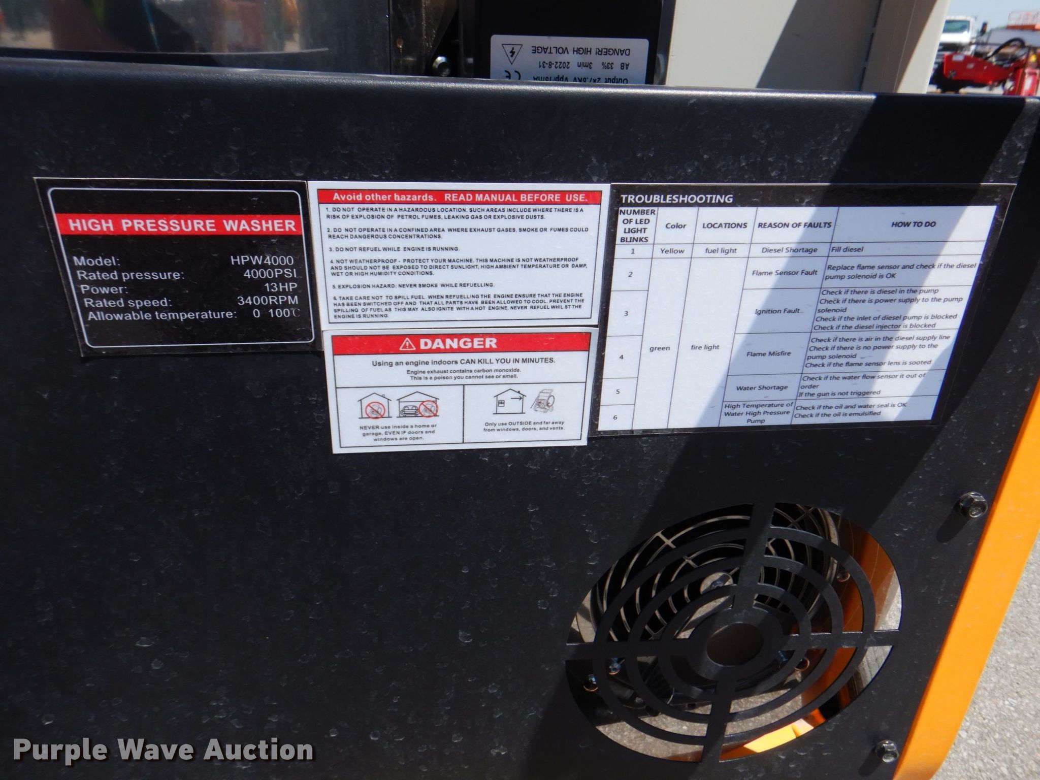 2023 AGT Industrial HPW4000 hot pressure washer. Engine. Model: PW420, Cylinders: 1, Fuel type: Gas. Features PSI: 4,310, Diesel fired burner. Notes Unused, Manual. Jordan Machinery / S & N Auto Sales. 25050 US Hwy 275. Waterloo, NE 68069