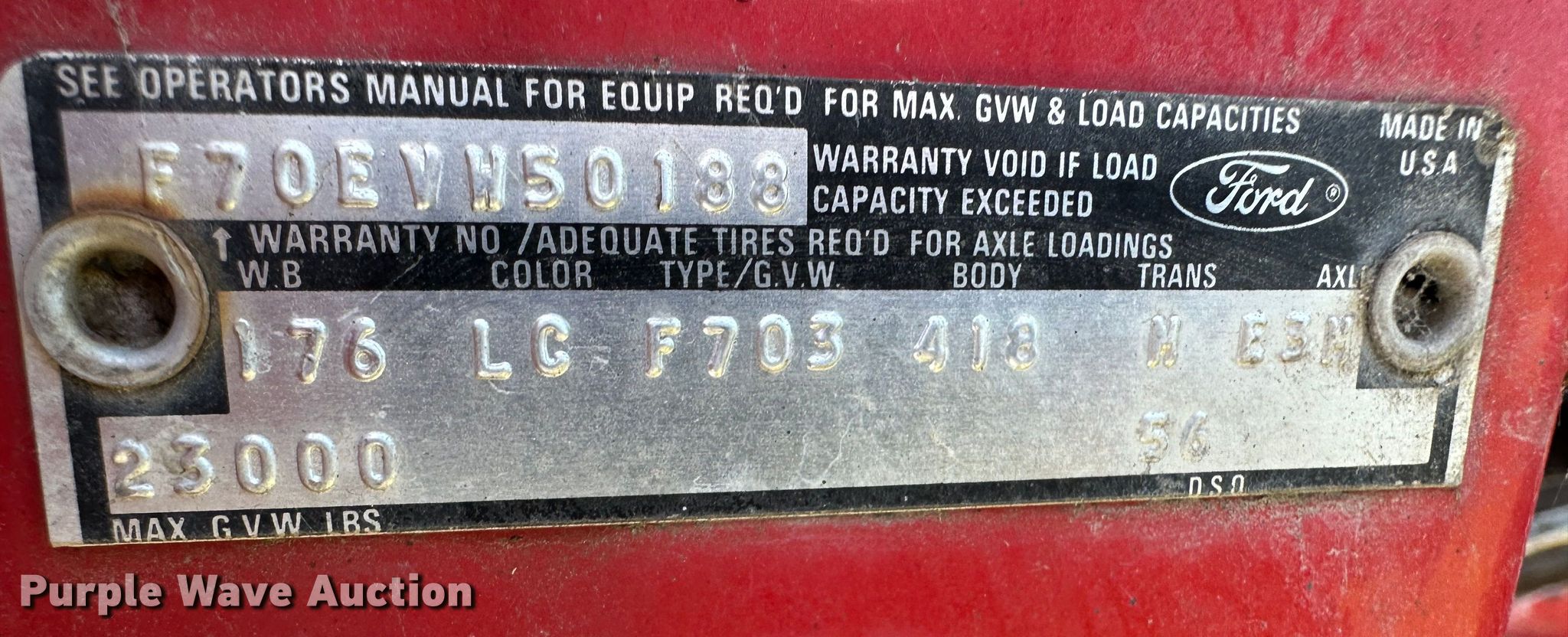 Purple Wave is selling a used Oil Distributor Truck in Missouri. This item is a 1975 Ford F700 oil distributor truck with the following: Miles: 33,510 on odometer, VIN: F70EVW50188