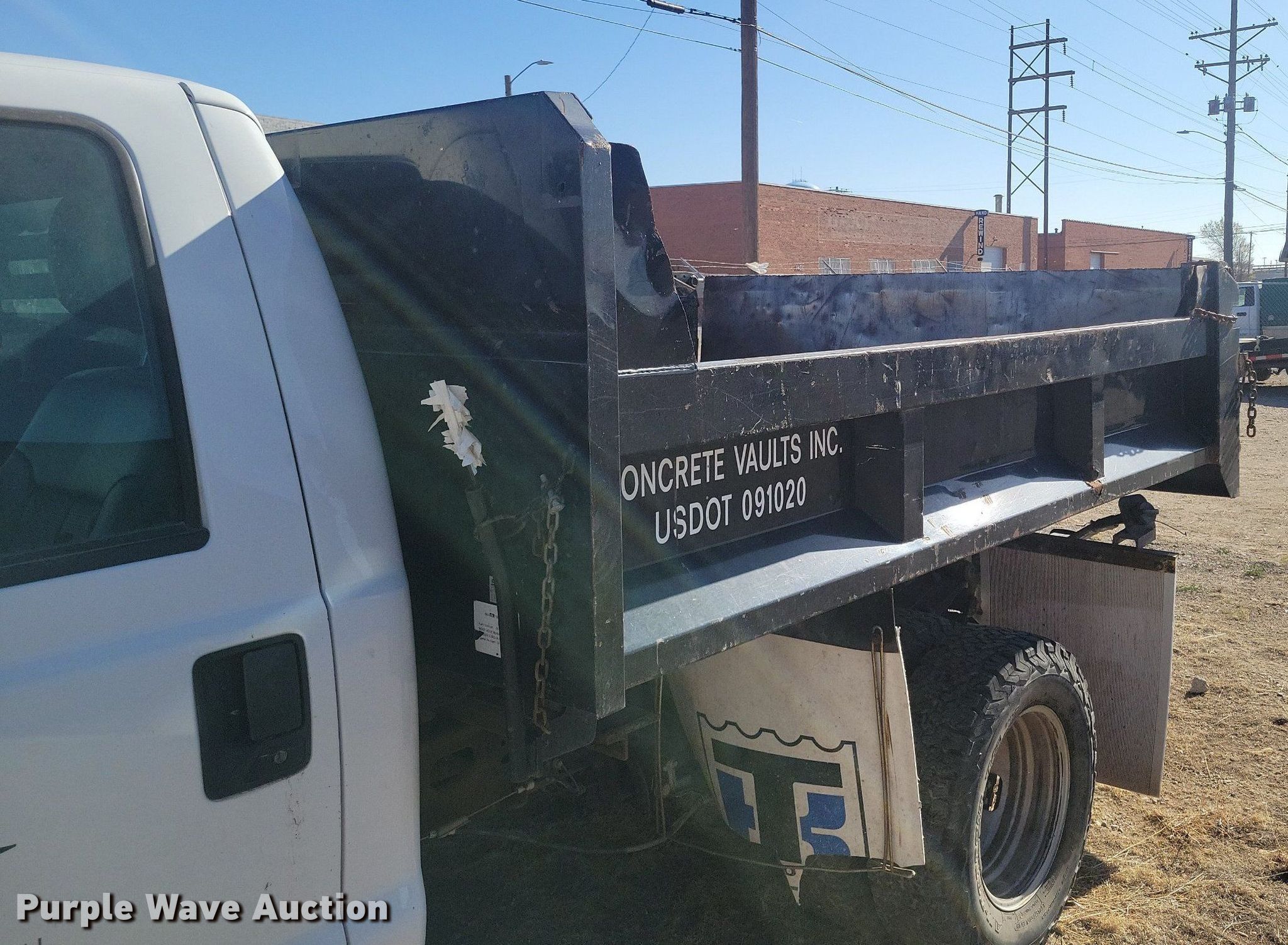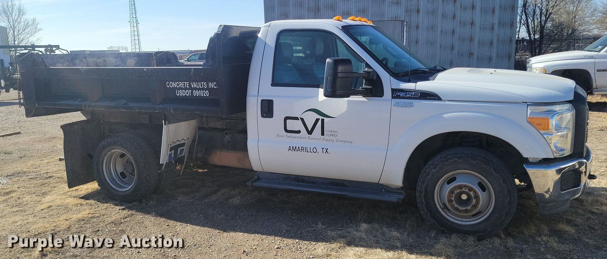 2014 Ford F350 Super Duty dump bed pickup truck. Miles: Unknown, VIN: 1FDRF3G67EEB41302. Engine Displacement: 6.2L V8 OHV , Cylinders: 8, Fuel type: Gas. Transmission Automatic. Interior AC, Heat, Cruise control. Features Dump bed 9' 4" L x 8' W, Manual tailgate. Tires Size: 245/75R17. Notes Windshield chipped or cracked, Hail damage, Dead battery, Non-operational engine, Non-operational unit. Texas title. Concrete Vaults, Inc.. 1400 Northeast 3rd Avenue. Amarillo, TX 79107