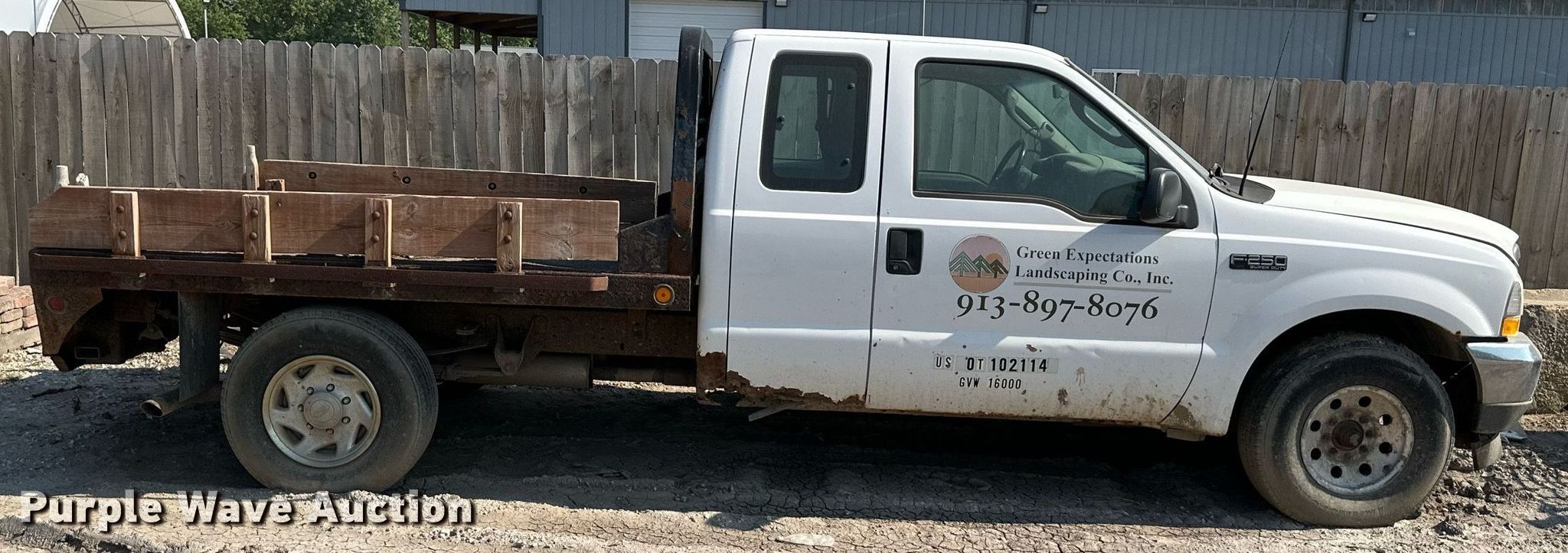2003 Ford F250 Super Duty SuperCab flatbed pickup truck. Miles: 211,459 on odometer, VIN: 1FDNX20LX3EB15036, Unit #: 8. Engine Displacement: 5.4L V8 SOHC, Cylinders: 8, Fuel type: Gas. Transmission Automatic. Interior AC, Heat. Features Flatbed 8' L x 83" W, Hitch: Gooseneck. Tires Size: 235/85R16. Notes Dash warning indicator: Brake, Windshield chipped or cracked, No battery , Unknown operating condition. Kansas title. Title distribution may be delayed up to 14 days from verification of funds. Green Expectations Landscaping Co., Inc... 1910 S 74th St. Kansas City, KS 66106
