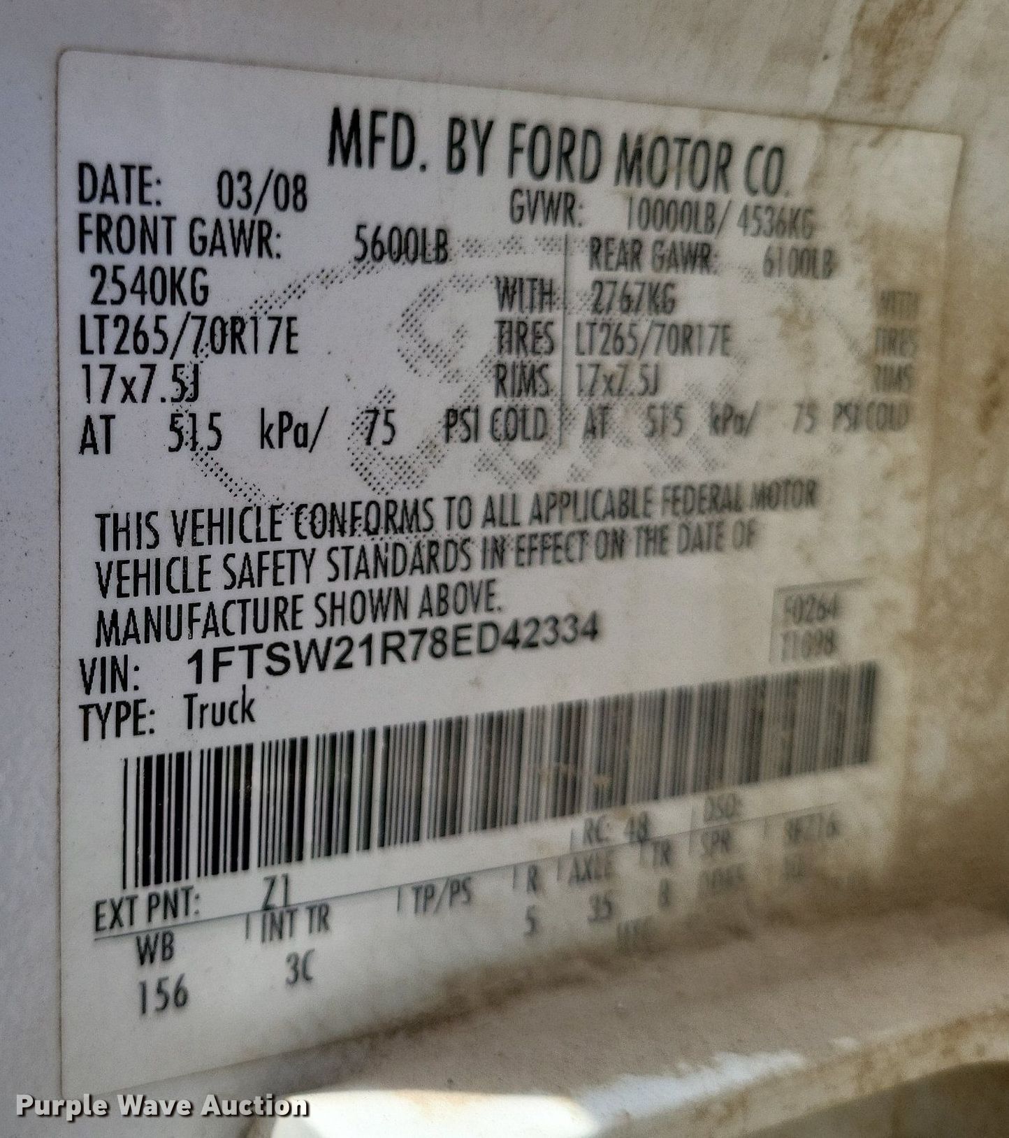 Purple Wave is selling a used 3/4 or 1 Ton Pickup or Van in Missouri. This item is a 2008 Ford F250 Super Duty XLT Crew Cab pickup truck with the following: Miles: 351,887 on odometer, VIN: 1FTSW21R78ED42334