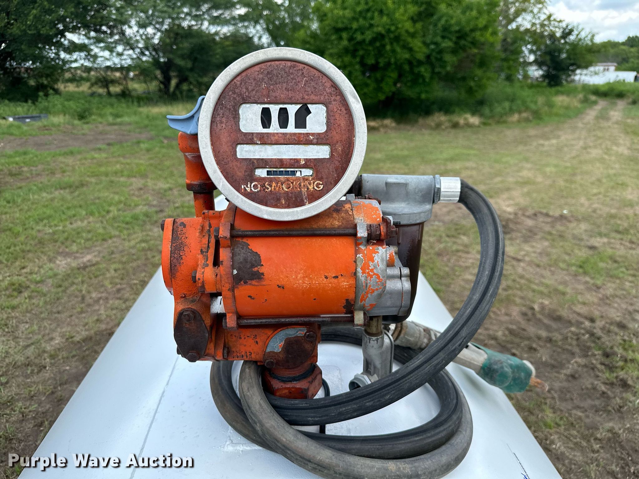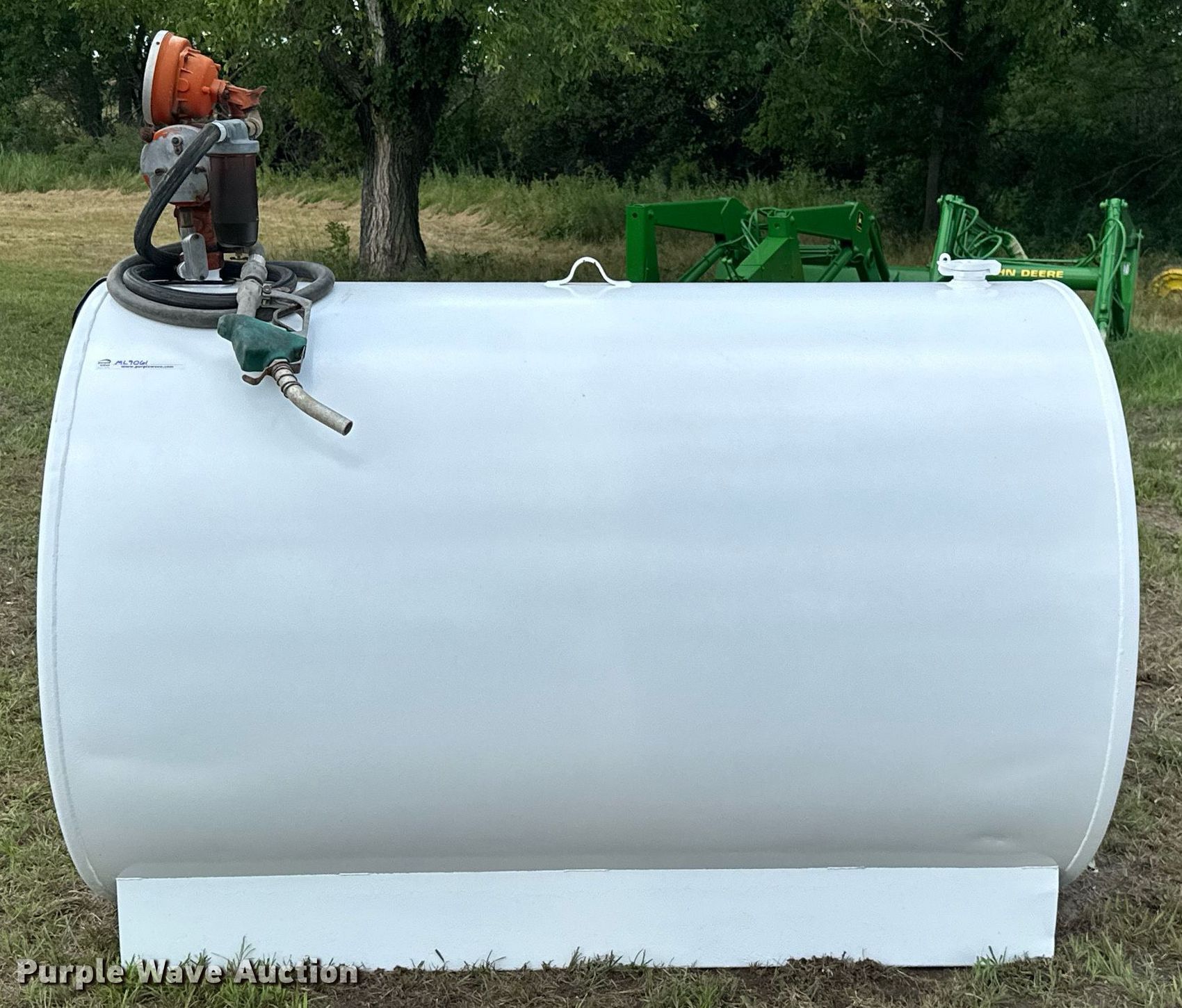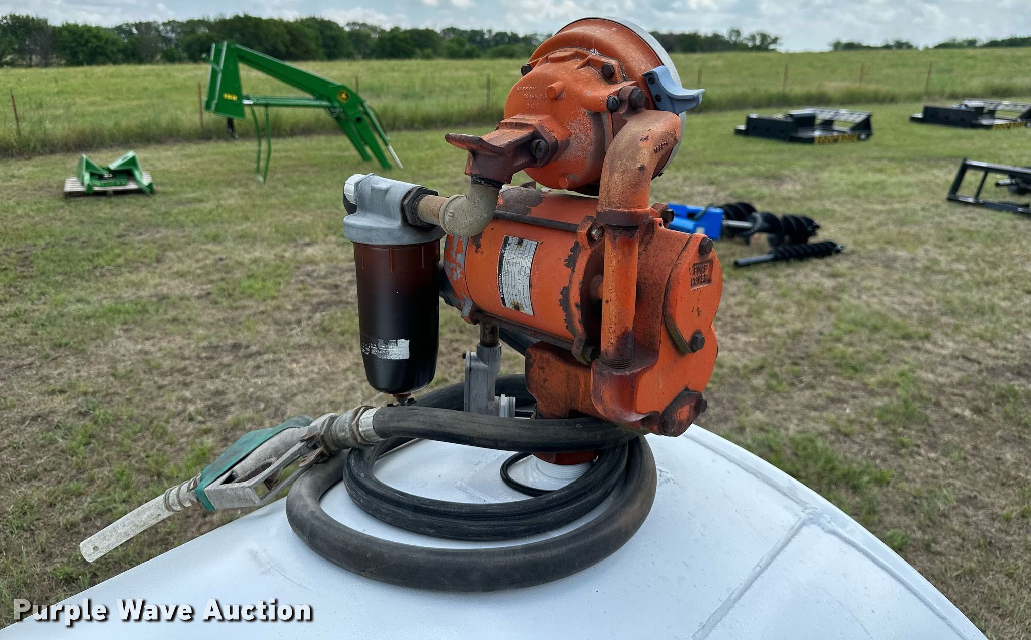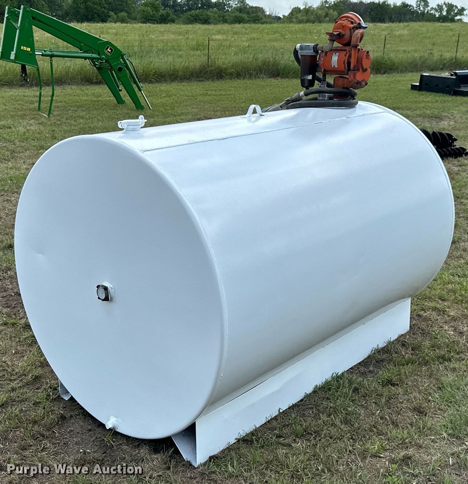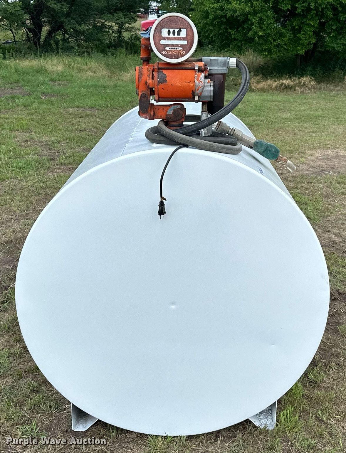 Purple Wave is selling a used Tanks in Kansas. This item is a Fuel tank with the following: 72" L x 48" diameter, Capacity: 500 gallons, Westinghouse pump, Phase: Single, HP: 1/2, Volts: 115