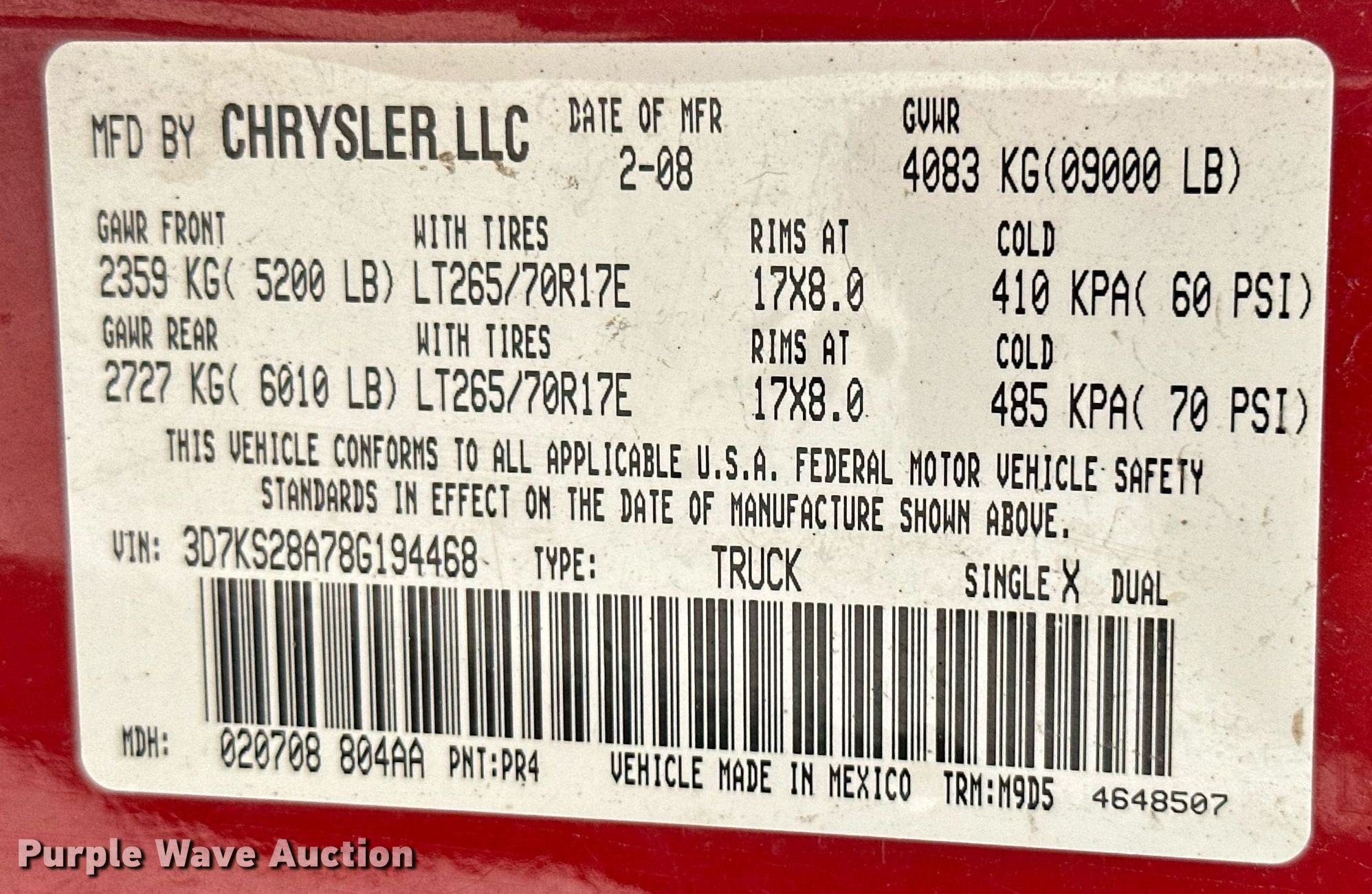 - VIN: 3D7KS28A78G194468