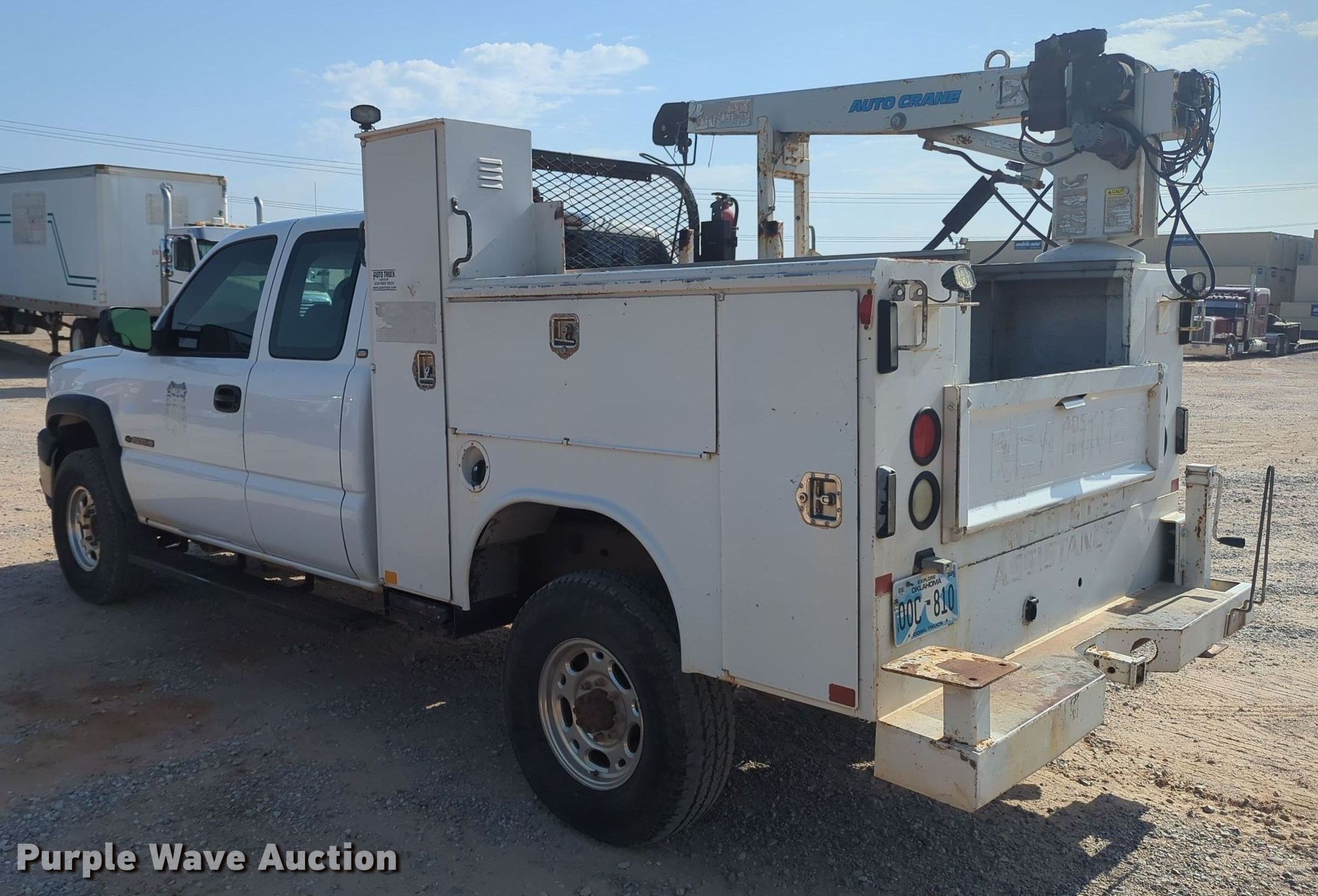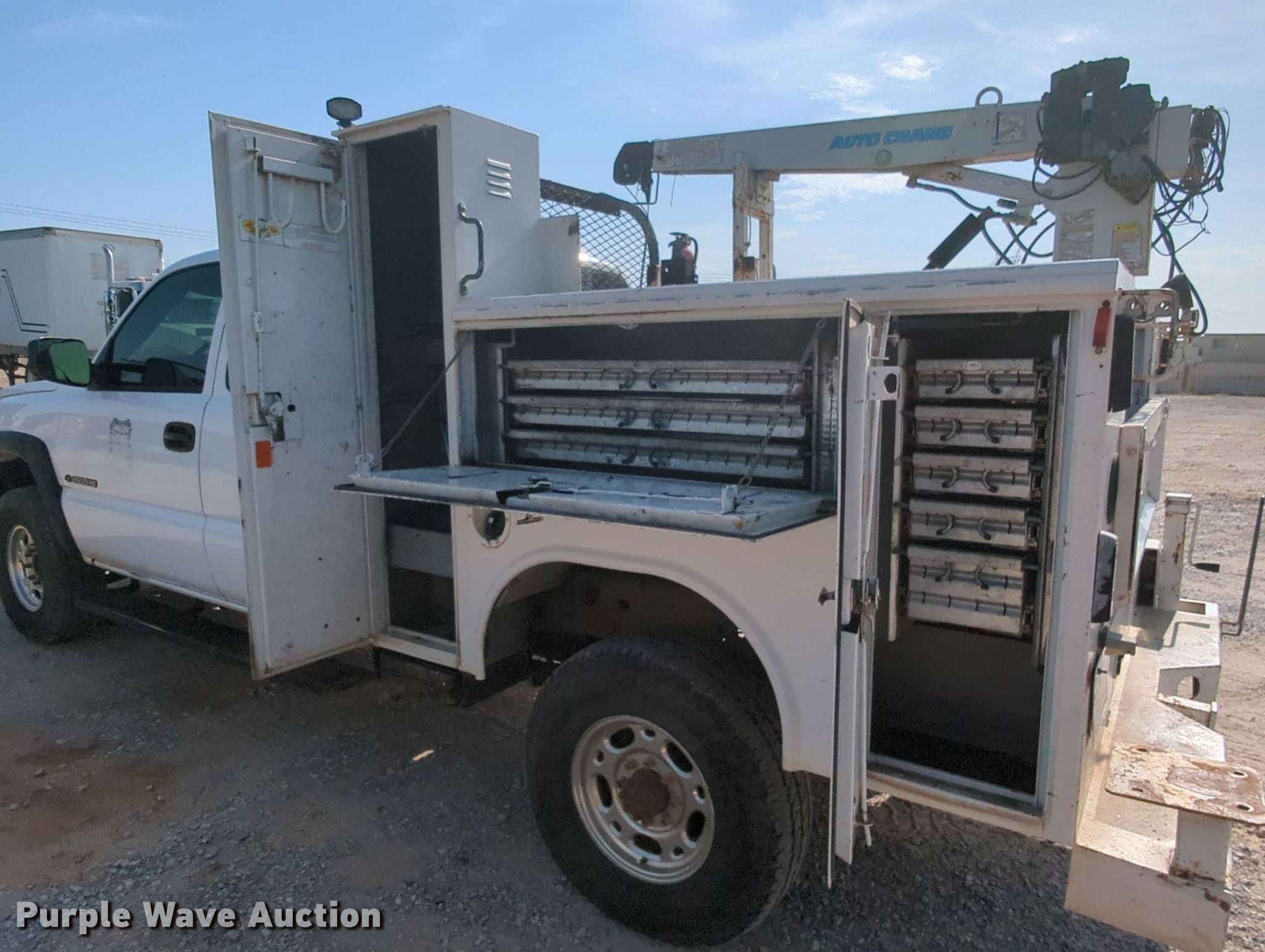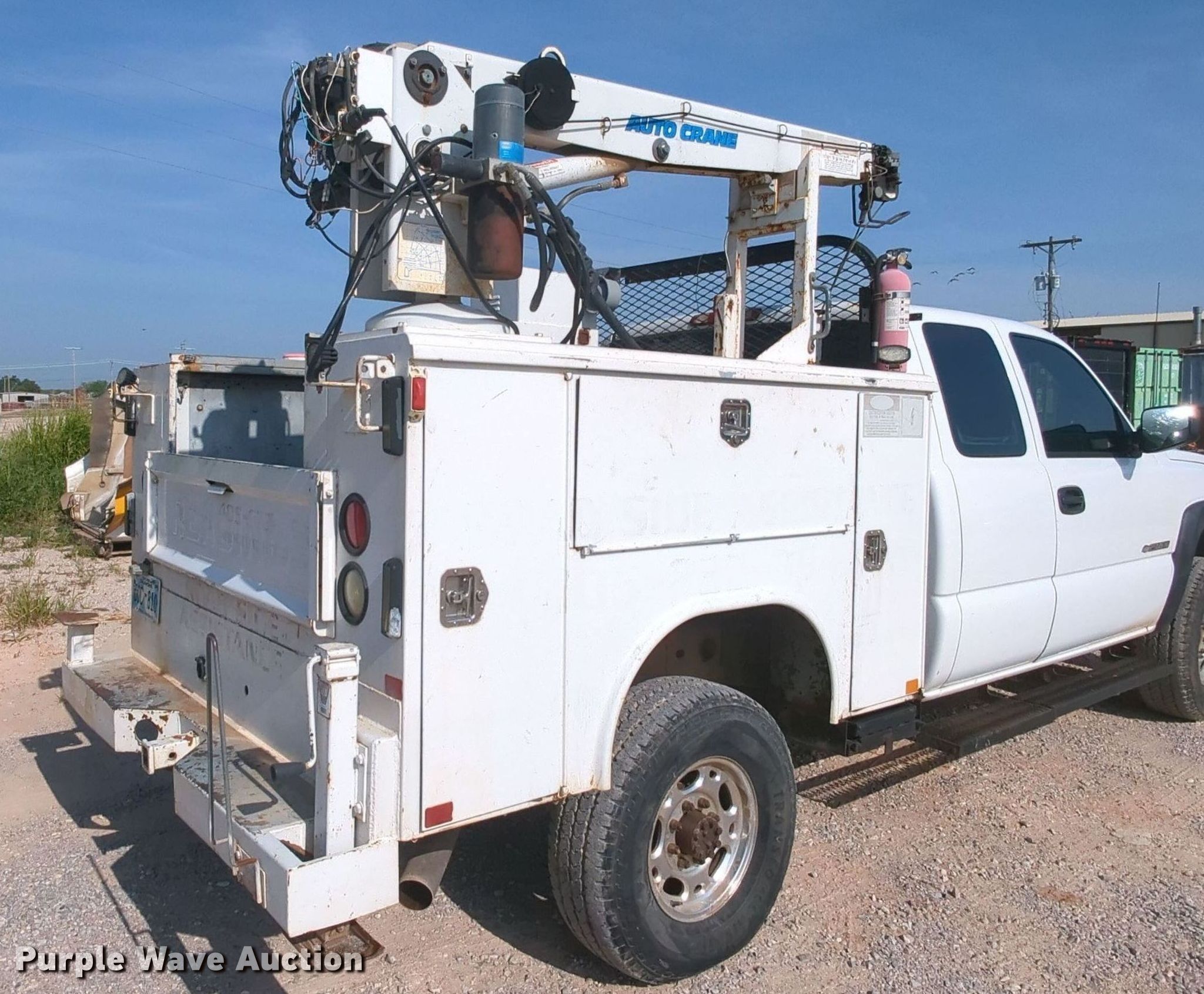 2005 Chevrolet Silverado 2500 HD Ext. Cab utility bed pickup truck. Miles: 286,069 on odometer, VIN: 1GCHC29U45E252694. Engine Displacement: 6.0L V8 OHV, Cylinders: 8, Fuel type: Gas. Transmission Automatic. Interior AC, Heat. Features Utility bed 80" L x 80" W, Auto crane Maximum boom length: 14' , Maximum lift capacity: 2,700 lbs. Tires Size: 265/85R16. Notes Rear seat missing, Dash warning indicator: Check engine. Oklahoma title. Title distribution may be delayed up to 14 days from verification of funds. Stringer Truck and Trailer Repair. Oklahoma City, OK 73156