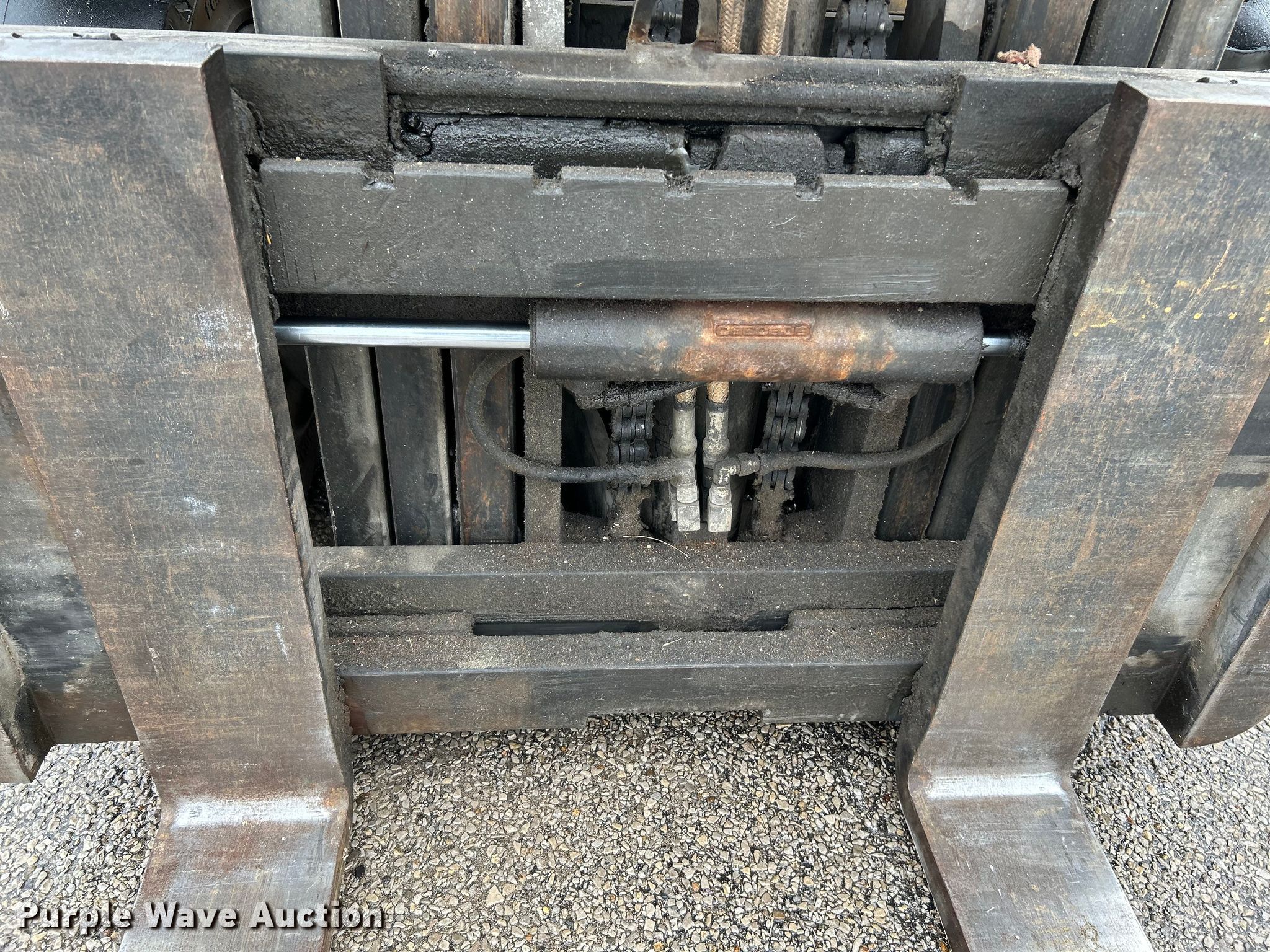 1998 Caterpillar GP30 forklift. Hours: 5,521 on meter, Serial: 7AM03688. Engine Cylinders: 4, Fuel type: LPG LP bottle: Included. Transmission Powershift. Features Maximum lift capacity: 6,000 lbs, Maximum lift height: 187", Mast stages: 3, Side shift, Mast tilt, Fork length: 46". Tires Front: 28x9-15, Rear: 6.50-10, Solid. R.P. Lumber Co., Inc.. 942 South Market Street. Waterloo, IL 62298