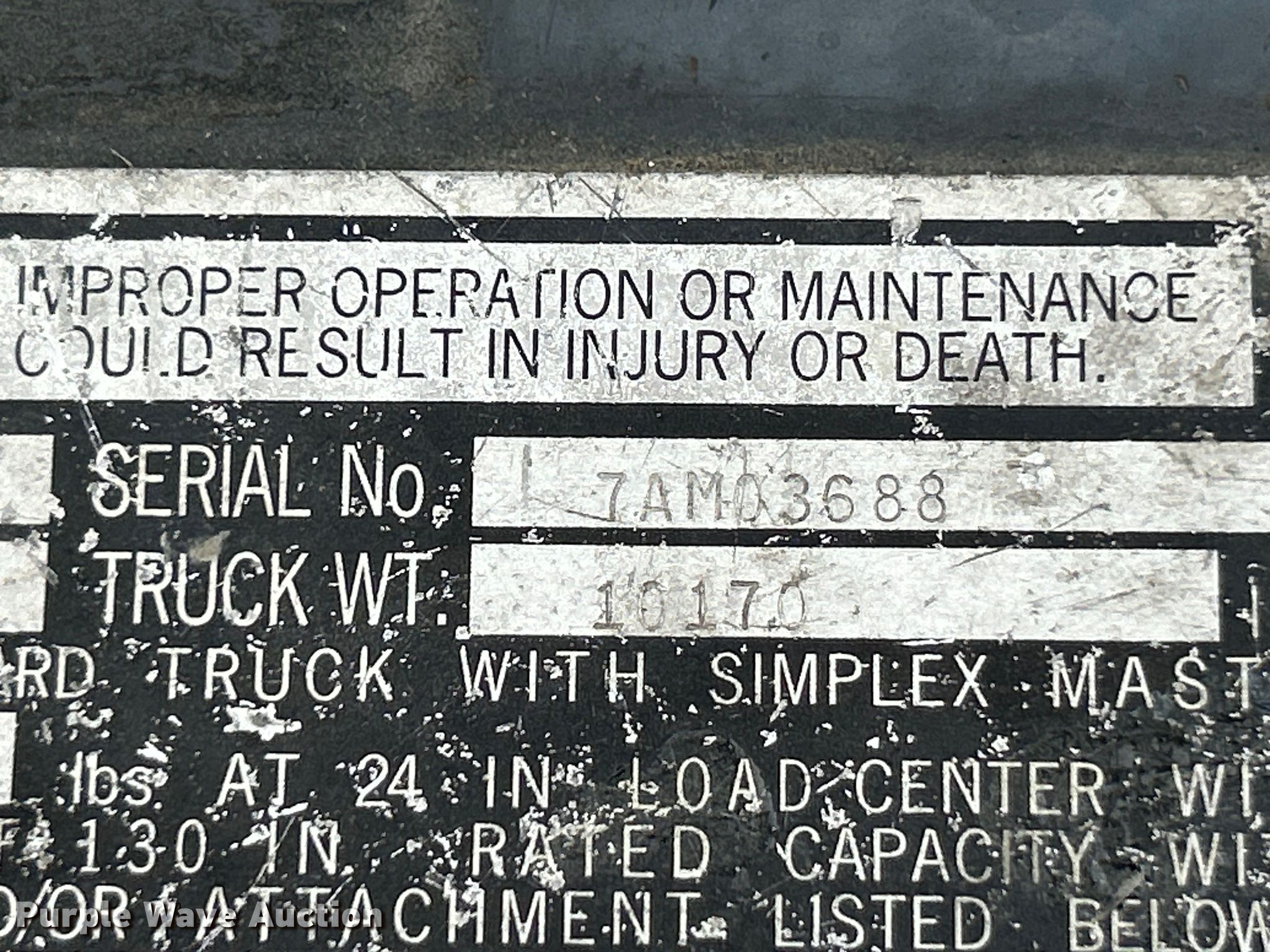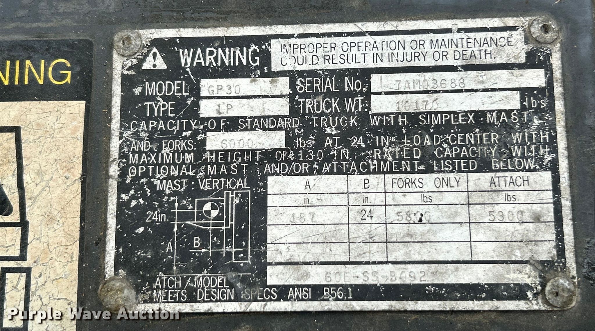 Purple Wave is selling a used Cushion Tire or Pneumatic Forklift in Illinois. This item is a 1998 Caterpillar GP30 forklift with the following: Hours: 5,521 on meter, Serial: 7AM03688