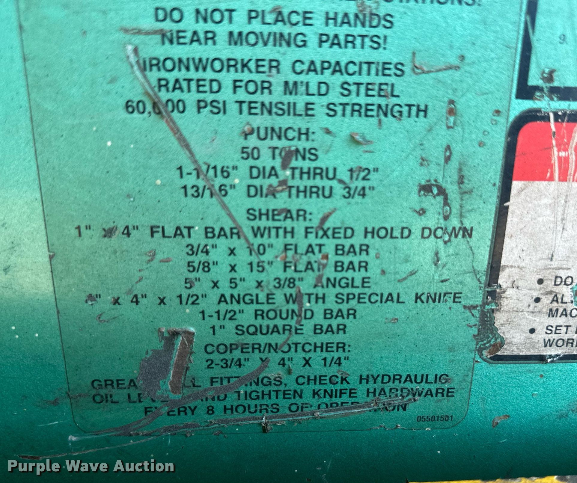 Purple Wave is selling a used Machine Shop Tools and Equip. in Kansas. This item is a Piranha P50 iron worker with the following: Serial: 10073, Additional die sets included