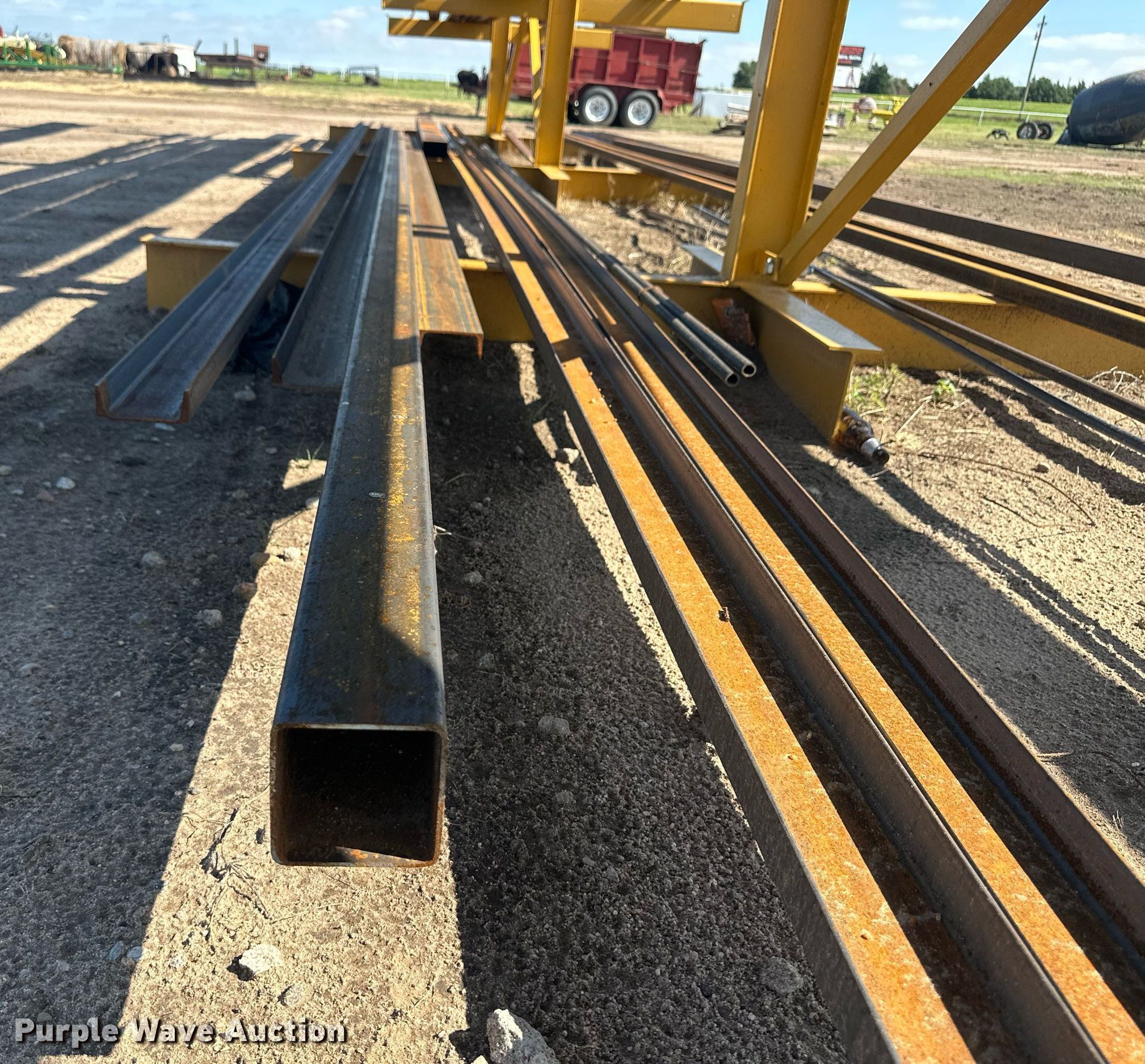 Building materials. (6) 18'6" L trailer frame rails, (24) 13'2"L I-beams, C-channel Lengths: 10' to 40', (2) shelves 16'L x 33"W x 10'H, 20'6"L x 33"W x 9'H, (2) 6'W x 10'H metal racks. Buckshot MFG. Sublette, KS 67877