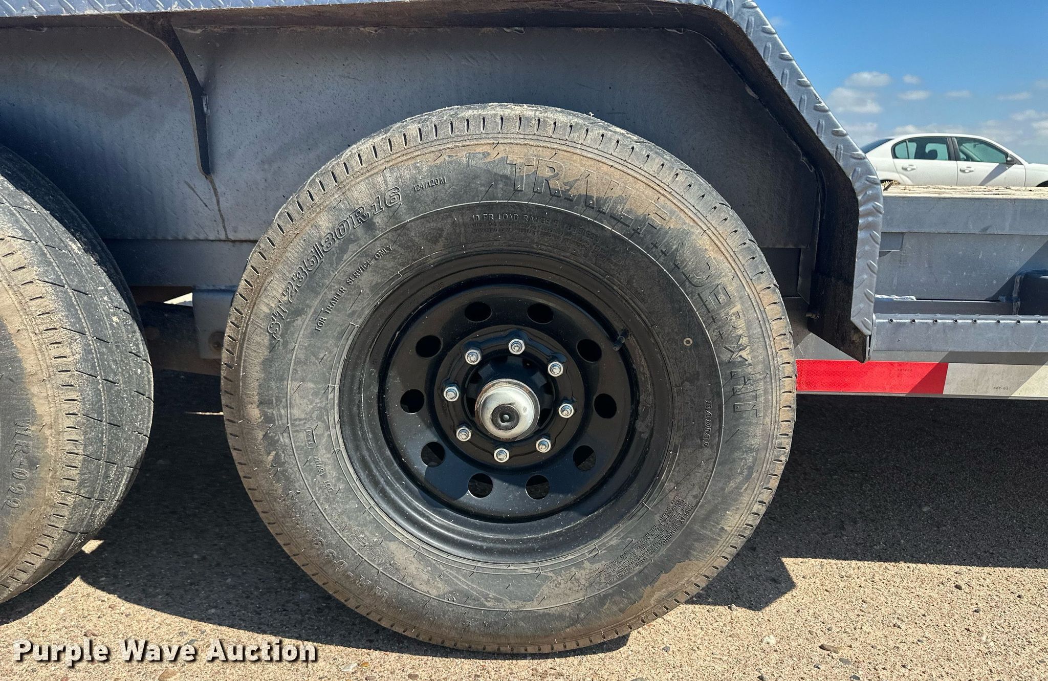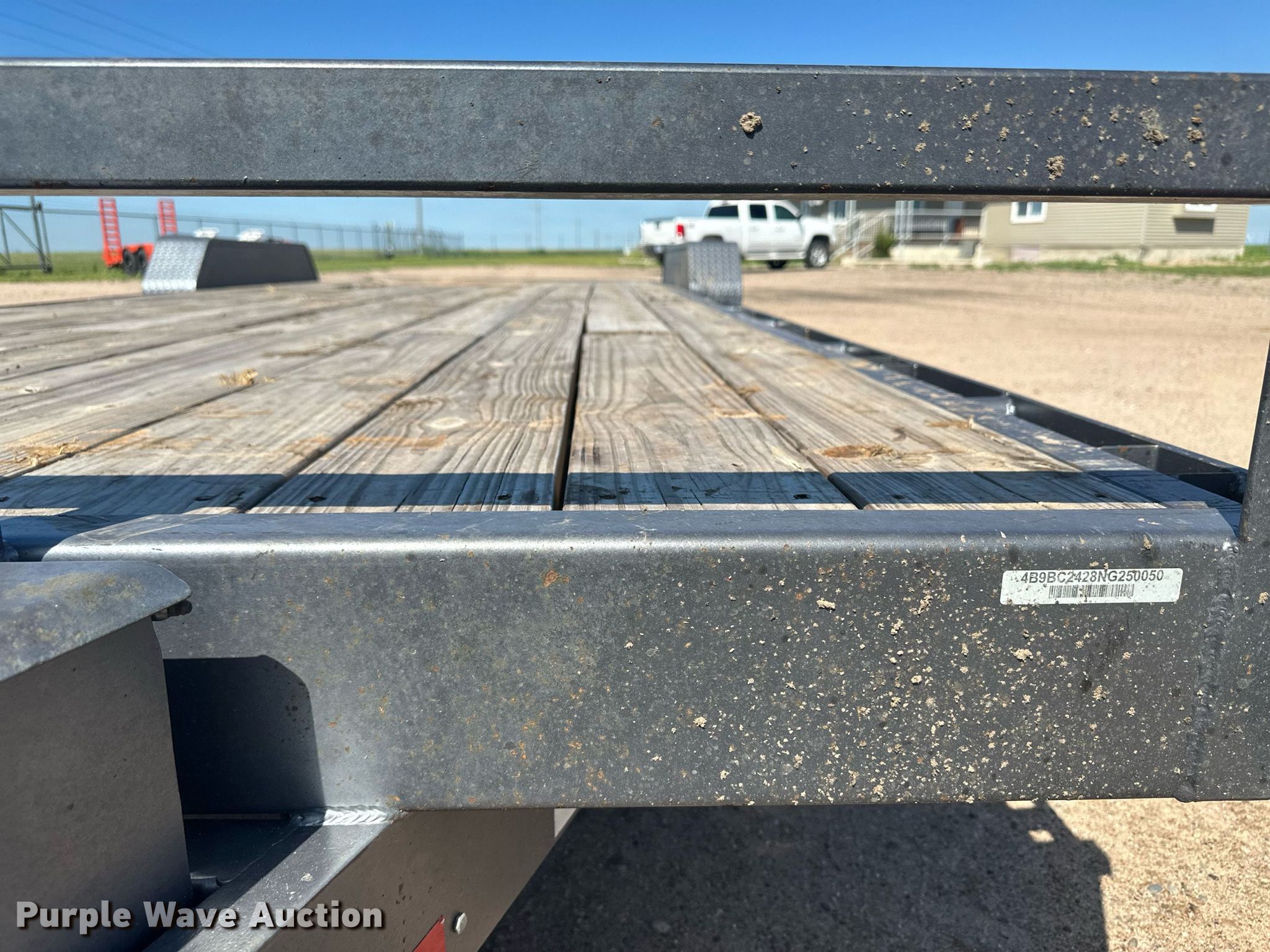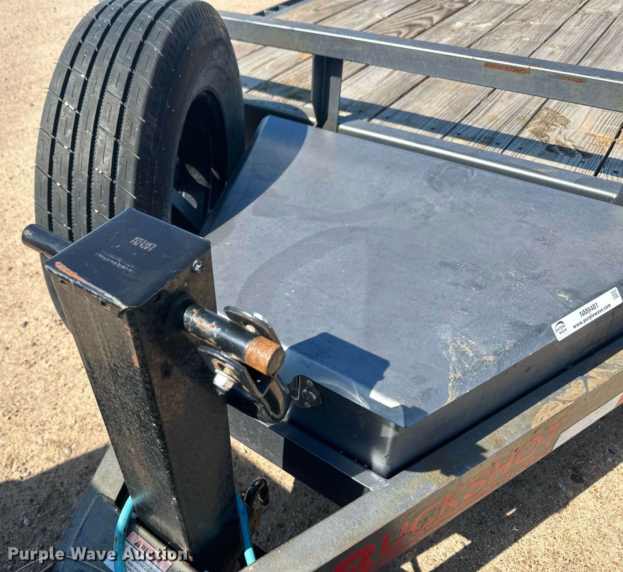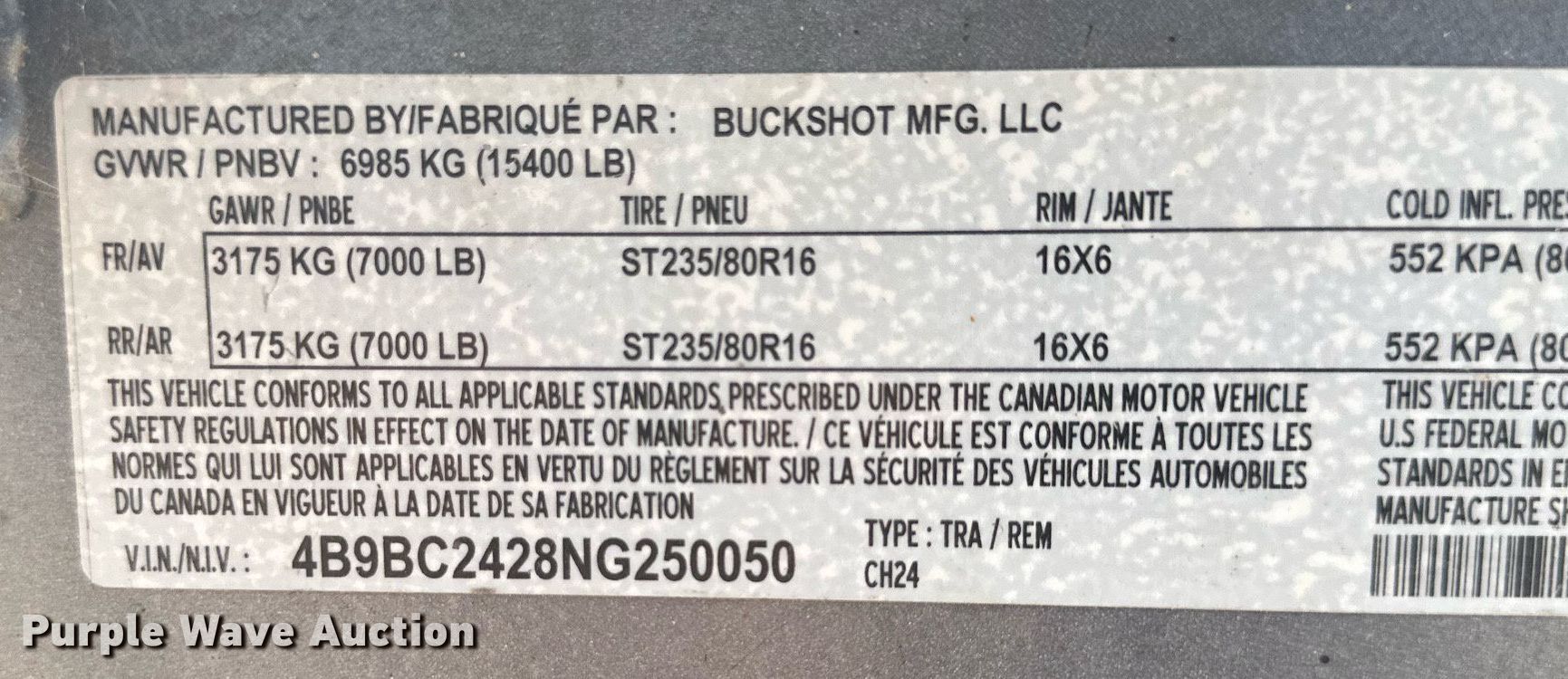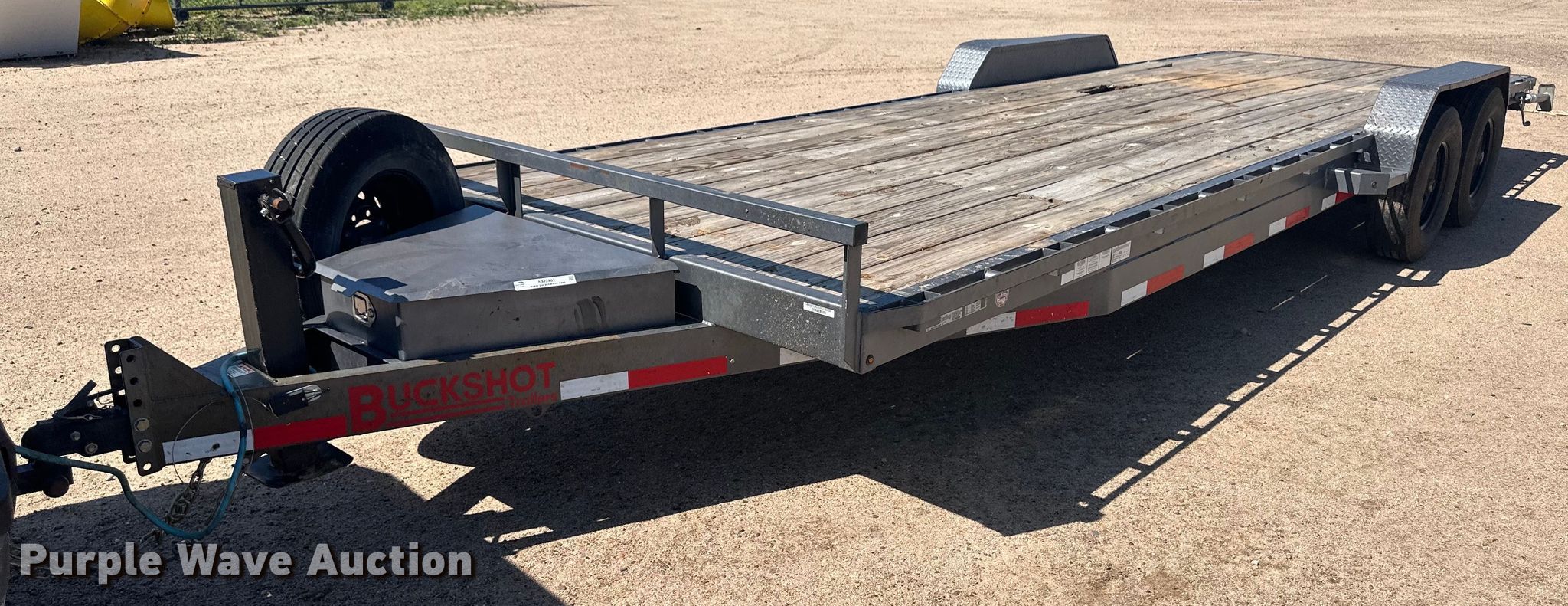 2022 Buckshot CH24 equipment trailer. VIN: 4B9BC2428NG250050. Dimensions Overall: 28' 6" L x 102" W, Deck: 24' L x 83" W, Deck height: 26". Features Deck type: Wood. Chassis Ball hitch: 2 5/16", Landing gear: Single, Suspension: Spring, Brakes: Electric, Axles: Tandem, GVWR: 15,400 lbs. Tires Steel wheels, Size: 235/80R16. Notes Truck not included. Kansas title. Title distribution may be delayed up to 14 days from verification of funds. Buckshot MFG. Sublette, KS 67877
