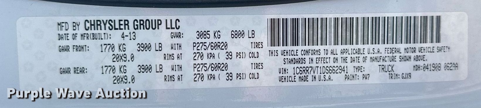 Purple Wave is selling a used 1/2 Ton Pickup or Van in Kansas. This item is a 2013 Dodge Ram 1500 Crew Cab pickup truck with the following: Miles: 144,968 on odometer, VIN: 1C6RR7VT1DS662941
