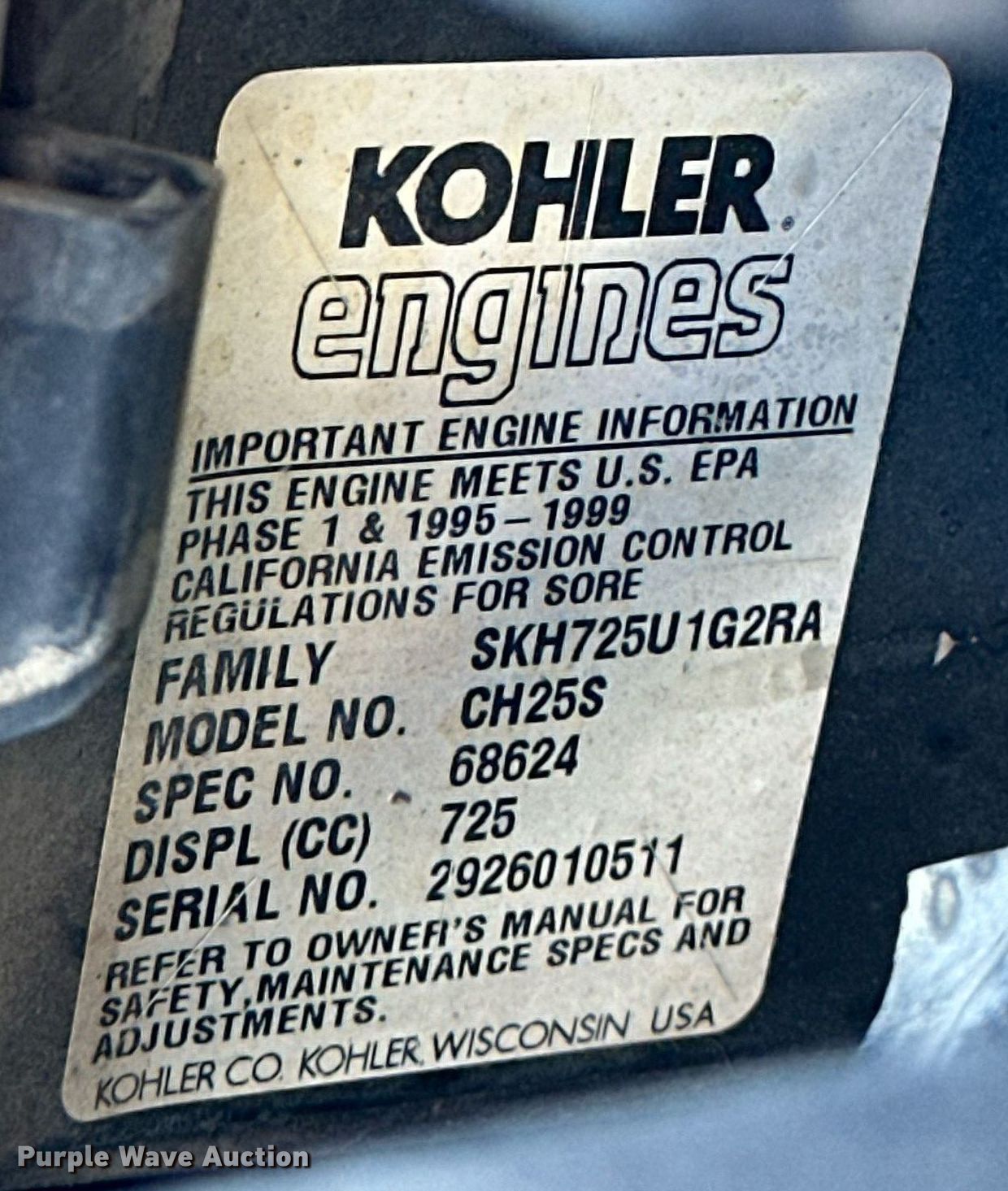 John Deere M665 ZTR lawn mower. Hours: 1,443 on meter, Cutting width: 60". Engine Kohler CH25S, Serial: 2926010511, Displacement: 725 cc, Cylinders: 2, Fuel type: Gas. Transmission Hydrostatic. Tires Front: 13x5.00-6, Rear: 23x10.50-12. Phillipsburg, KS 67661