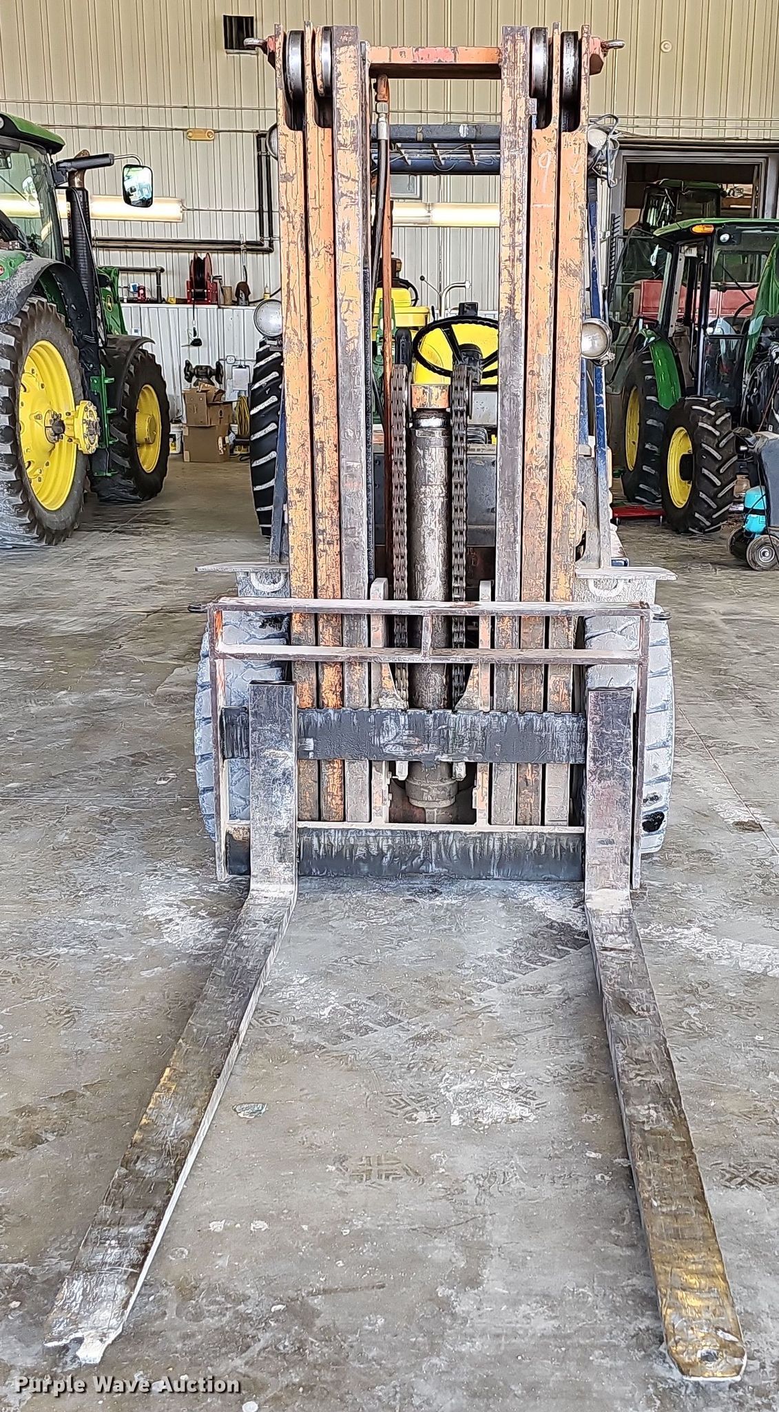 Toyota 02-5FD45 forklift. Hours: 8,196 on meter, Serial: 5FD45-15532. Engine Toyota , Cylinders: 6, Fuel type: Gas. Transmission Powershift, 2F - 1R. Operators station Canopy. Features Maximum lift capacity: 9,300 lbs, Maximum lift height: 185", Mast stages: 3, Mast tilt, Fork length: 72". Tires Front: 355/65-15, Rear: 7.00-12, Solid. Heritage Tractor. 208 State Rd A. Lockwood, MO 65682