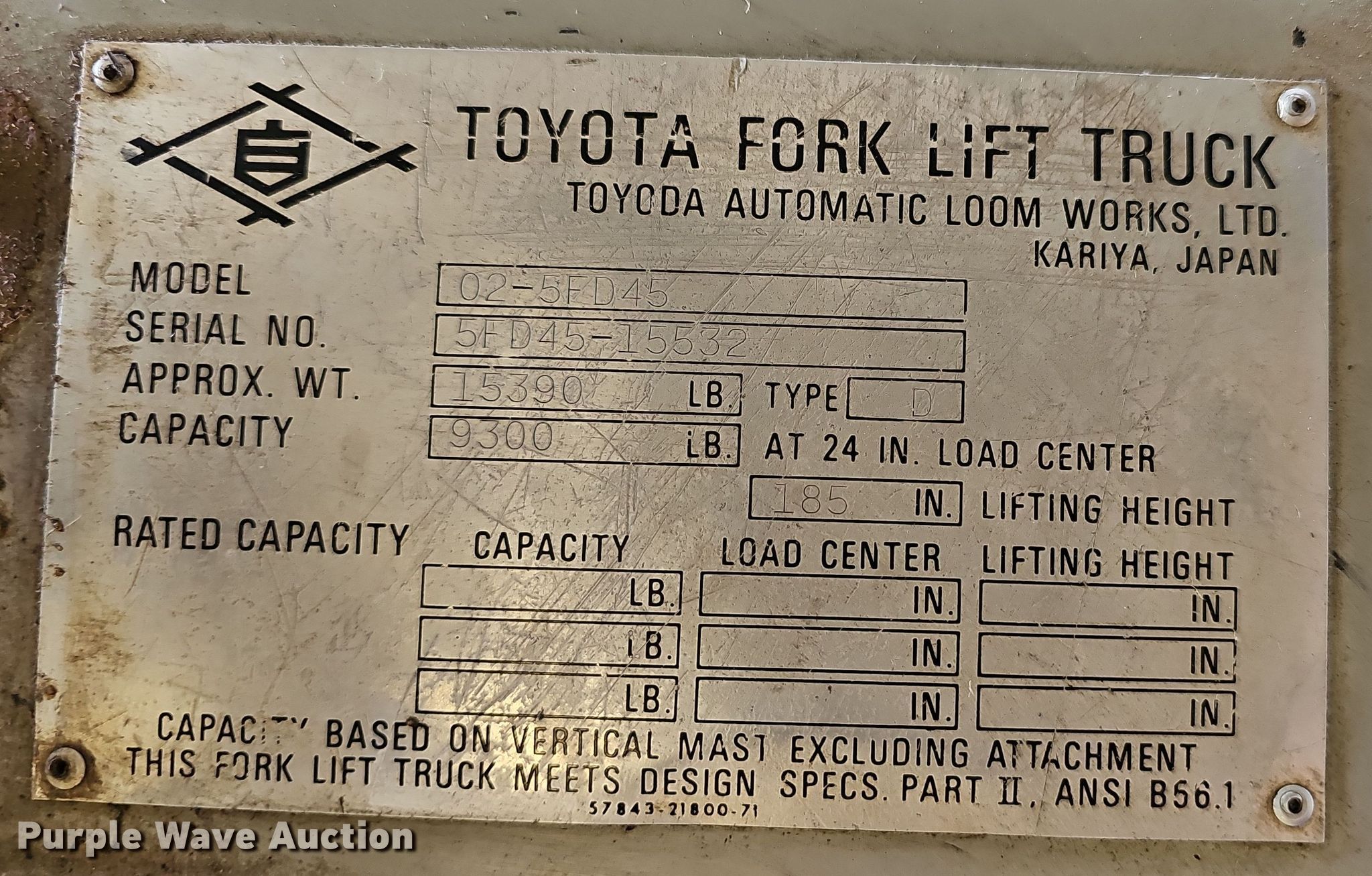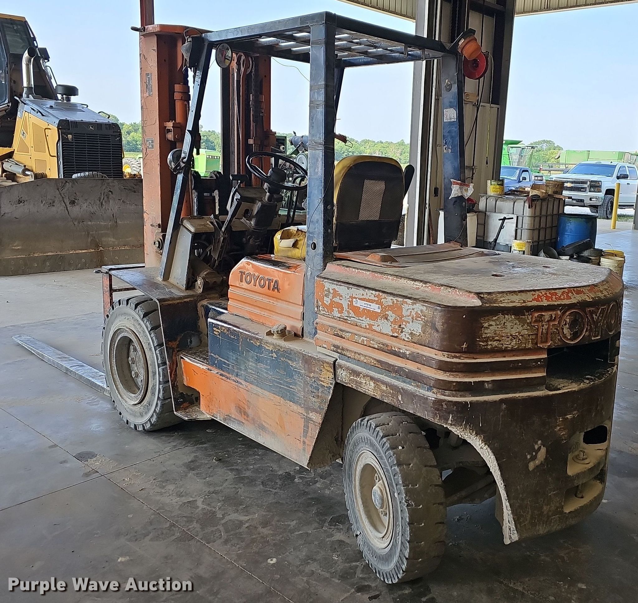 Purple Wave is selling a used Cushion Tire or Pneumatic Forklift in Missouri. This item is a Toyota 02-5FD45 forklift with the following: Hours: 8,196 on meter, Serial: 5FD45-15532
