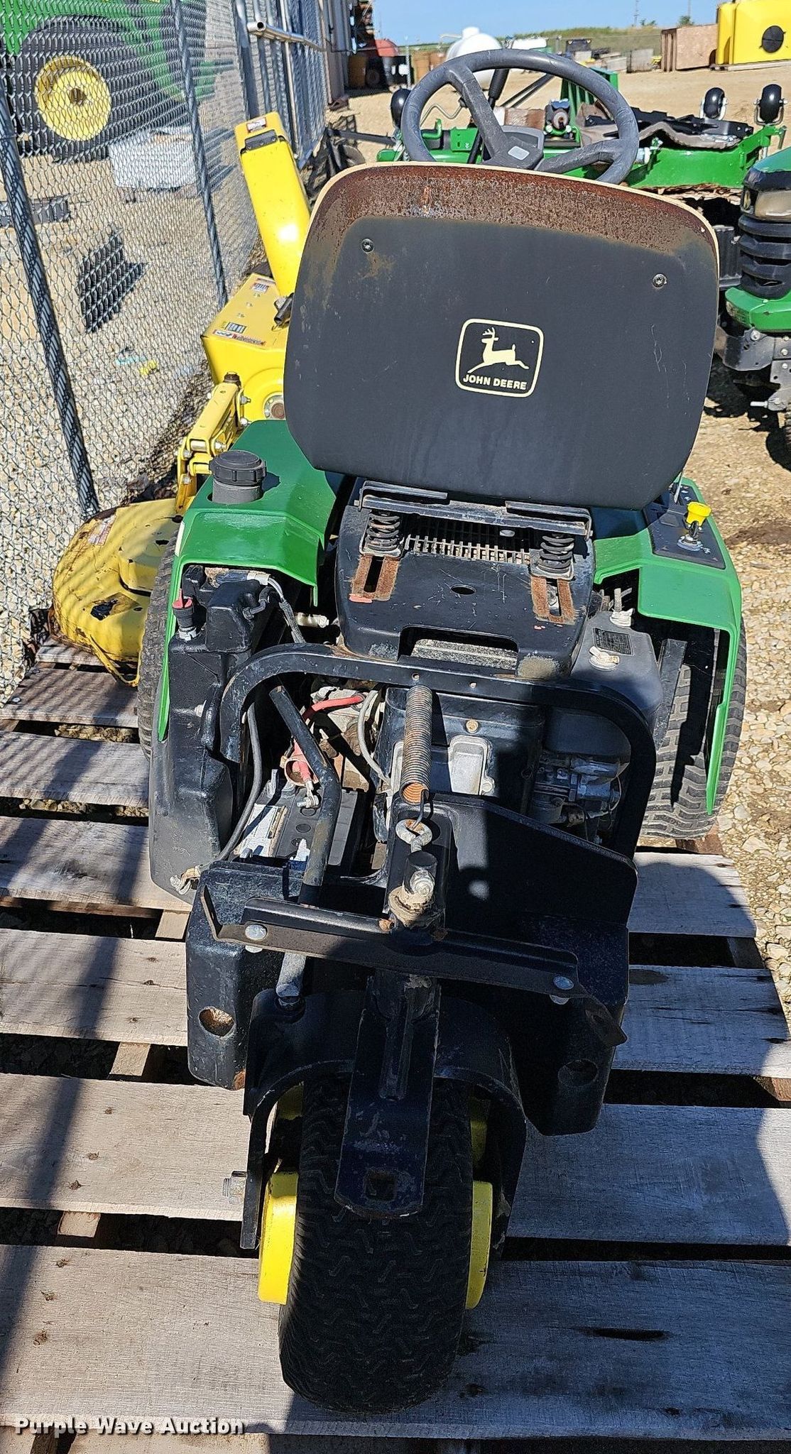 (2) John Deere F525 lawn mowers. Cutting width: 48", Serial: MOF525X120364, MOF525A130156. Engine Kawasaki PA540A, Cylinders: 1, Fuel type: Gas. Transmission Hydrostatic. Tires Front: 18x8.50-8, Rear: 13x6.00-6. Notes Parts only, Parts missing, Flat tires, Non-operational units. Prairie Land Partners. 1300 S Buckeye Ave. Abilene, KS 67410