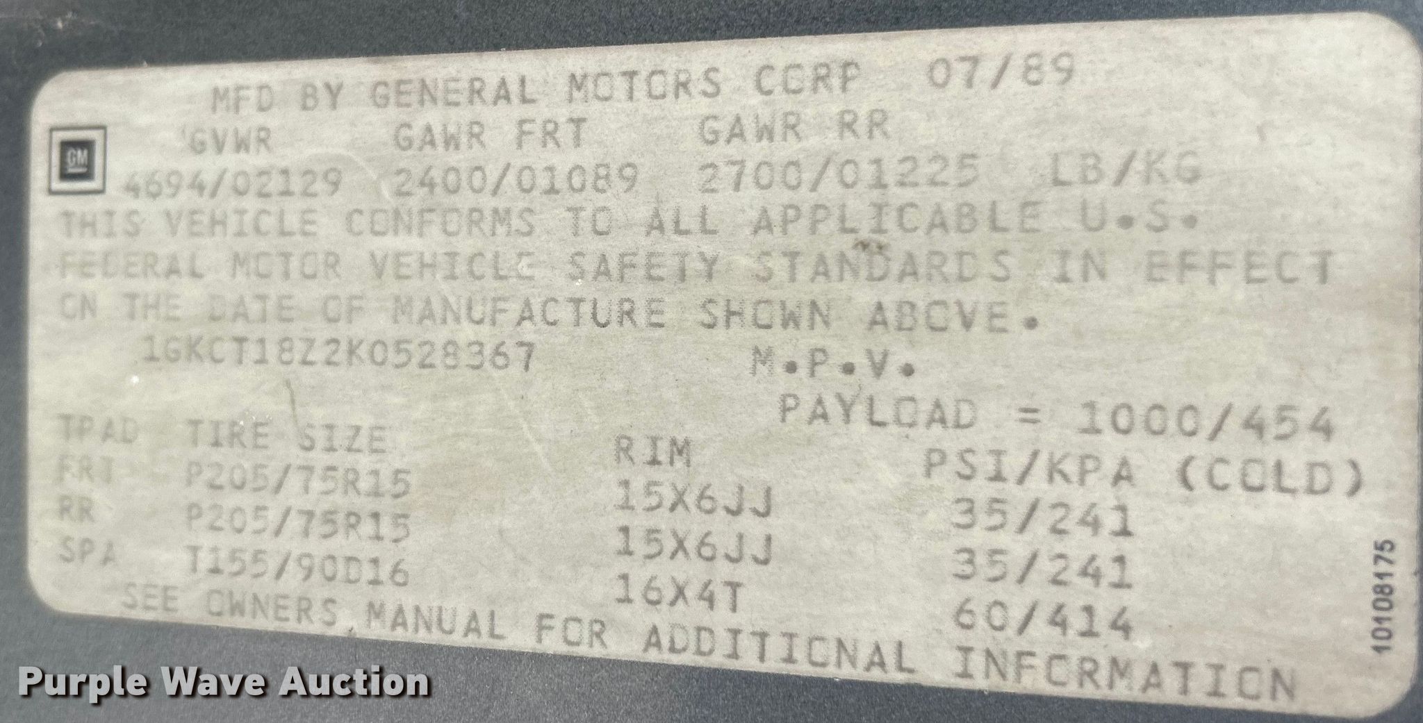 Purple Wave is selling a used Passenger Vehicle in Missouri. This item is a 1989 GMC S15 Jimmy SUV with the following: Miles: 240,109 on odometer, VIN: 1GKCT18Z2K0528367