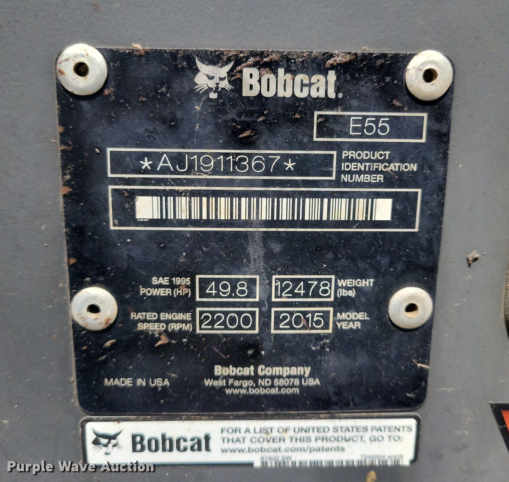 Purple Wave is selling a used Mini Excavator in Iowa. This item is a 2015 Bobcat E55 mini excavator with the following: Hours: 4,191 on meter, Serial: AJ1911367
