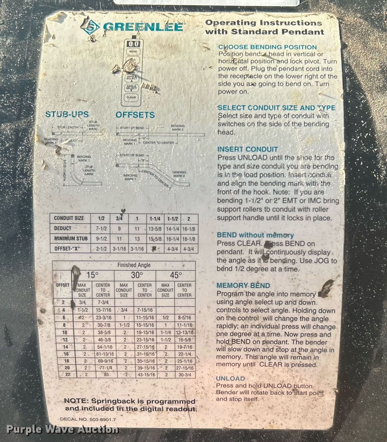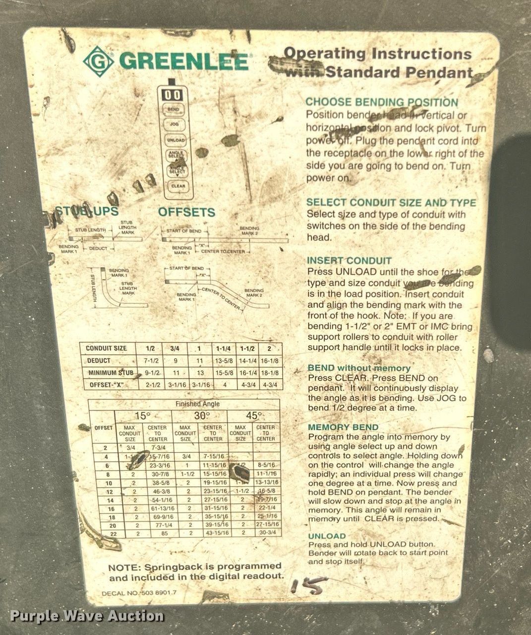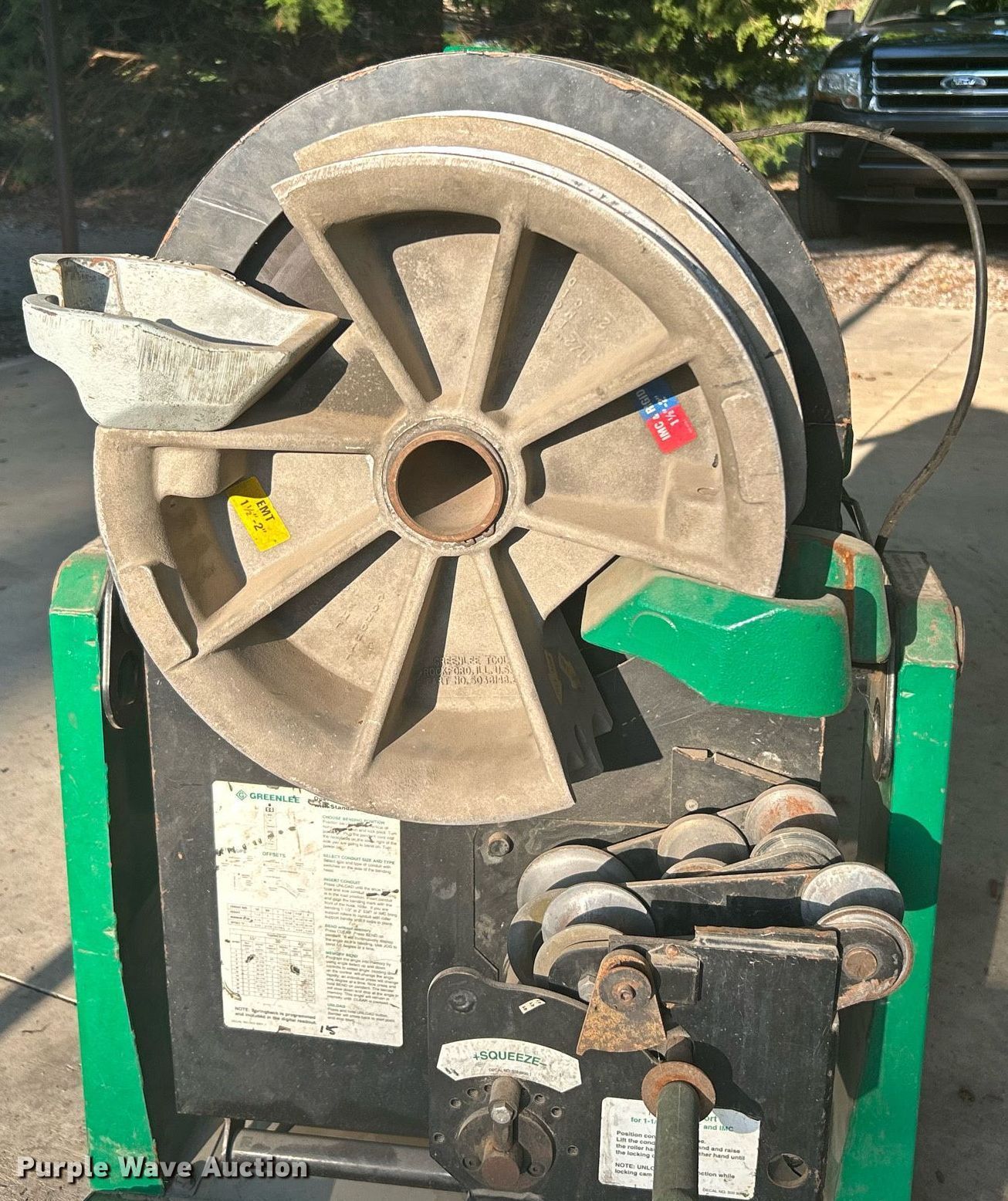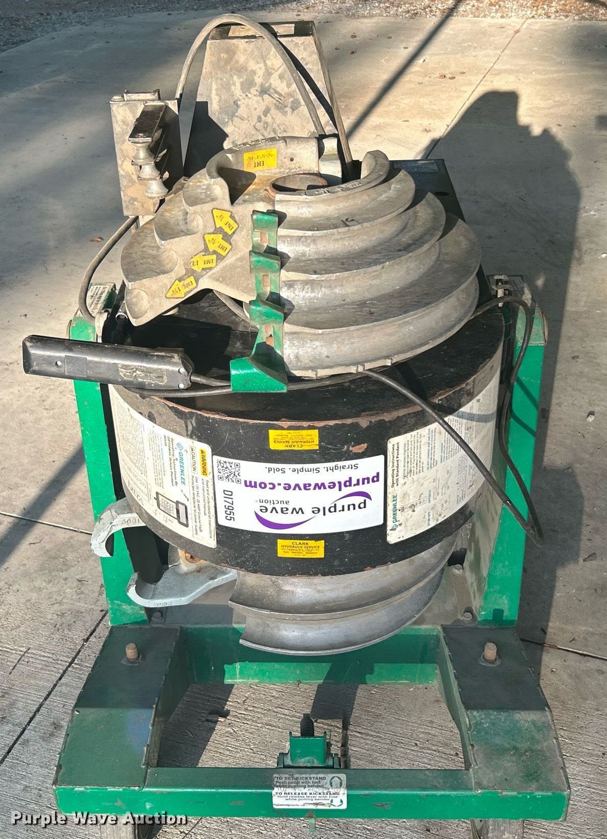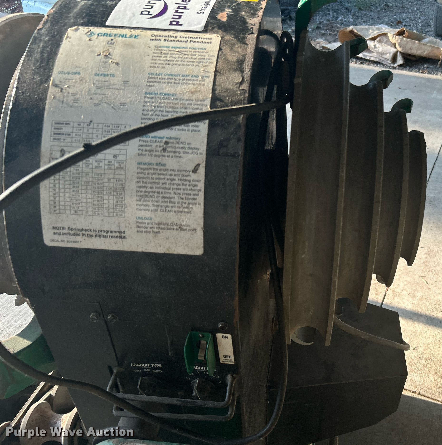 Purple Wave is selling a used Tools in Oklahoma. This item is a Greenlee 855 Smart Bender conduit bender with the following: Serial: ZW164KE, 1/2" to 2" conduit capacity, Remote control