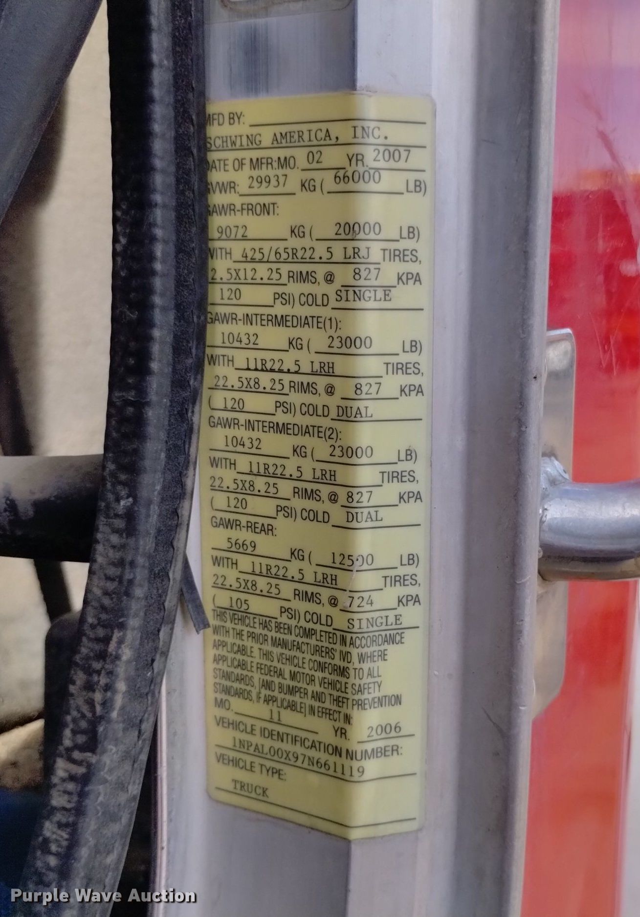 2007 Peterbilt 357 ready mix truck. Miles: 270,270 on odometer, Hours: 22,039 on meter, VIN: 1NPAL00X97N661119. Engine Cummins , Displacement: 10.8L, Cylinders: 6, Fuel type: Diesel. Transmission Eaton Fuller, Manual. Chassis Axles: 3, Tag axle, Differential lock: Full, Suspension: Spring, Brakes: Air, GVWR: 66,000 lbs FAWR: 20,000 lbs, IAWR: 23,000 lbs, RAWR: 23,000 lbs. Interior AC, Heat, Power windows, Cruise control. Features Mixer Schwing, Capacity: 11 cu.yd., Discharge: Rear, In-cab controls, Rear drum controls, Water tank capacity: 125 gallons, Chute Extensions: 3, Chute type: Steel.. Tires Front: 425/65R22.5, Rear: 11R22.5. Notes Dash warning indicator: ABS. Colorado title. Title distribution may be delayed up to 14 days from verification of funds. Zavalas Concrete. 7463 Dahlia Street. Commerce City, CO 80022