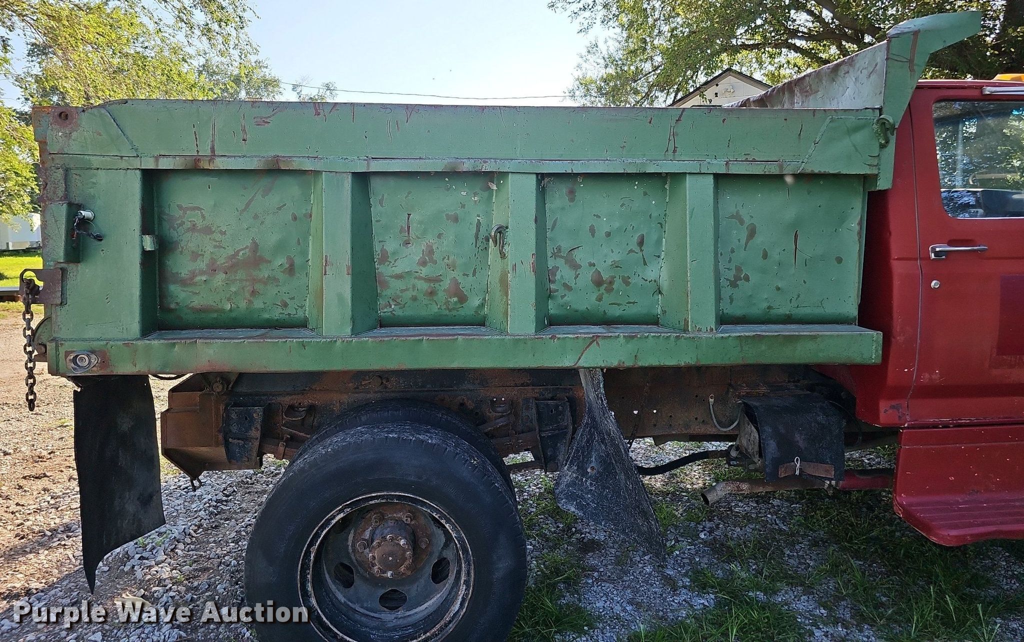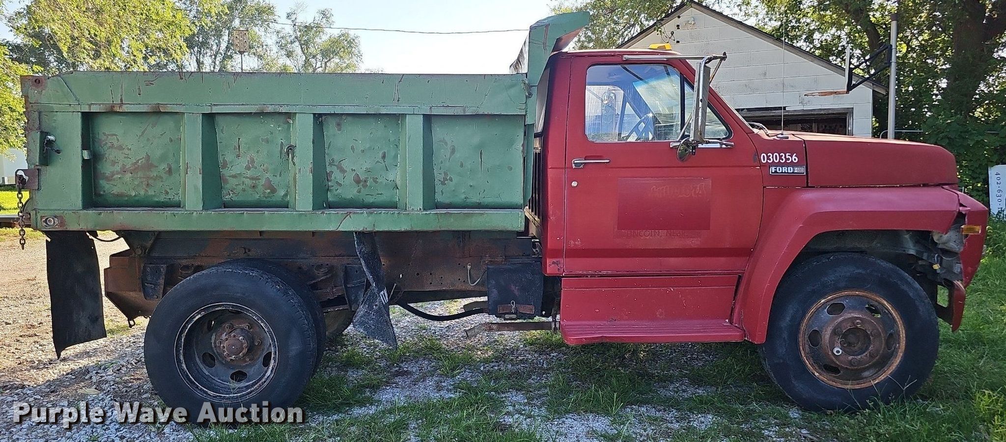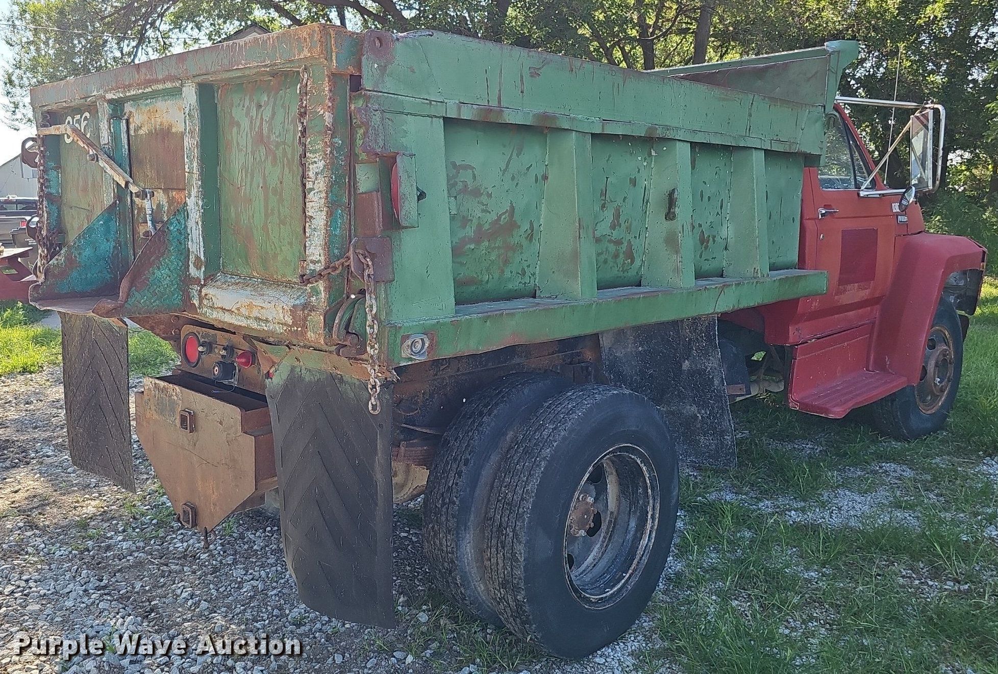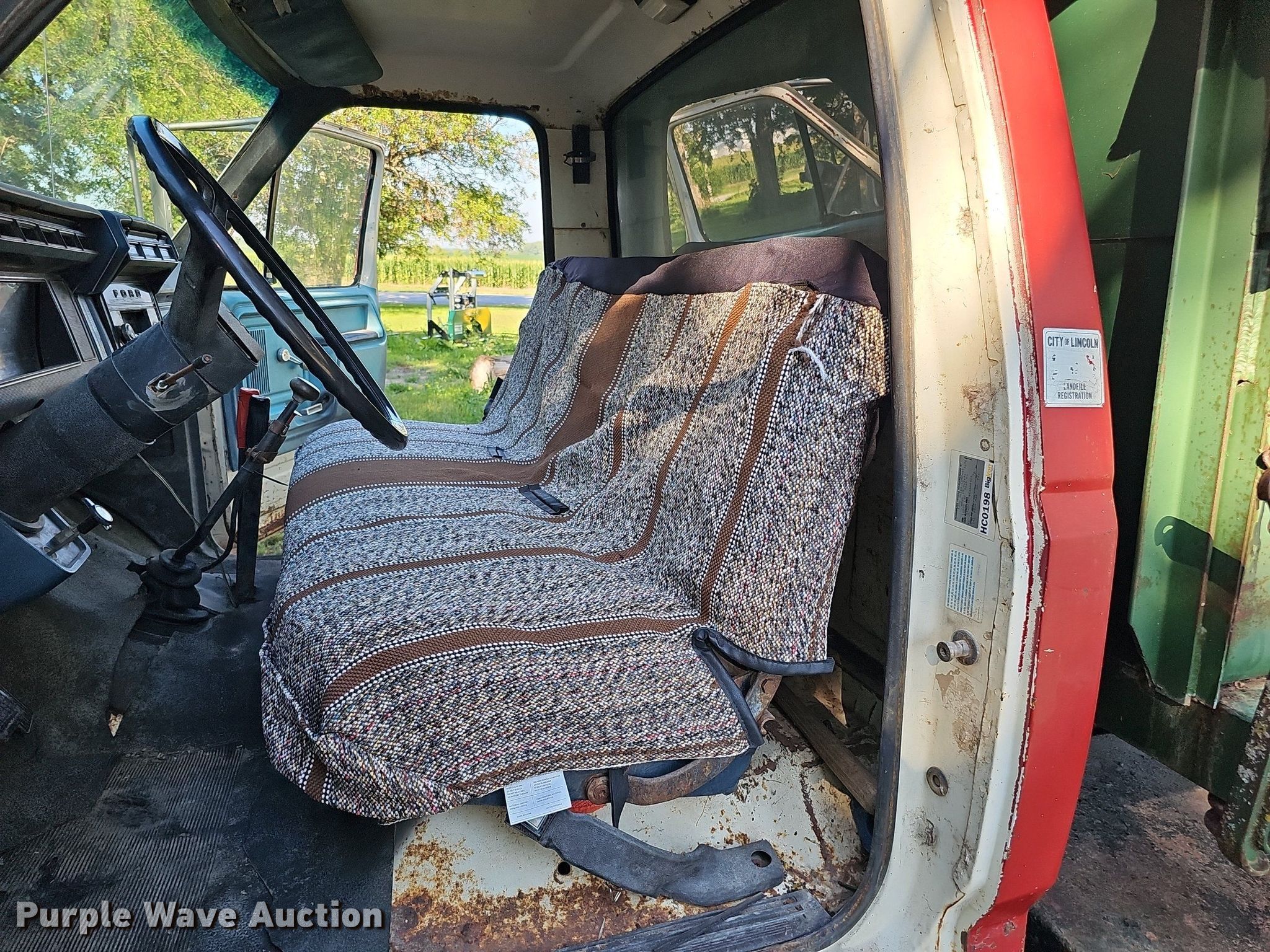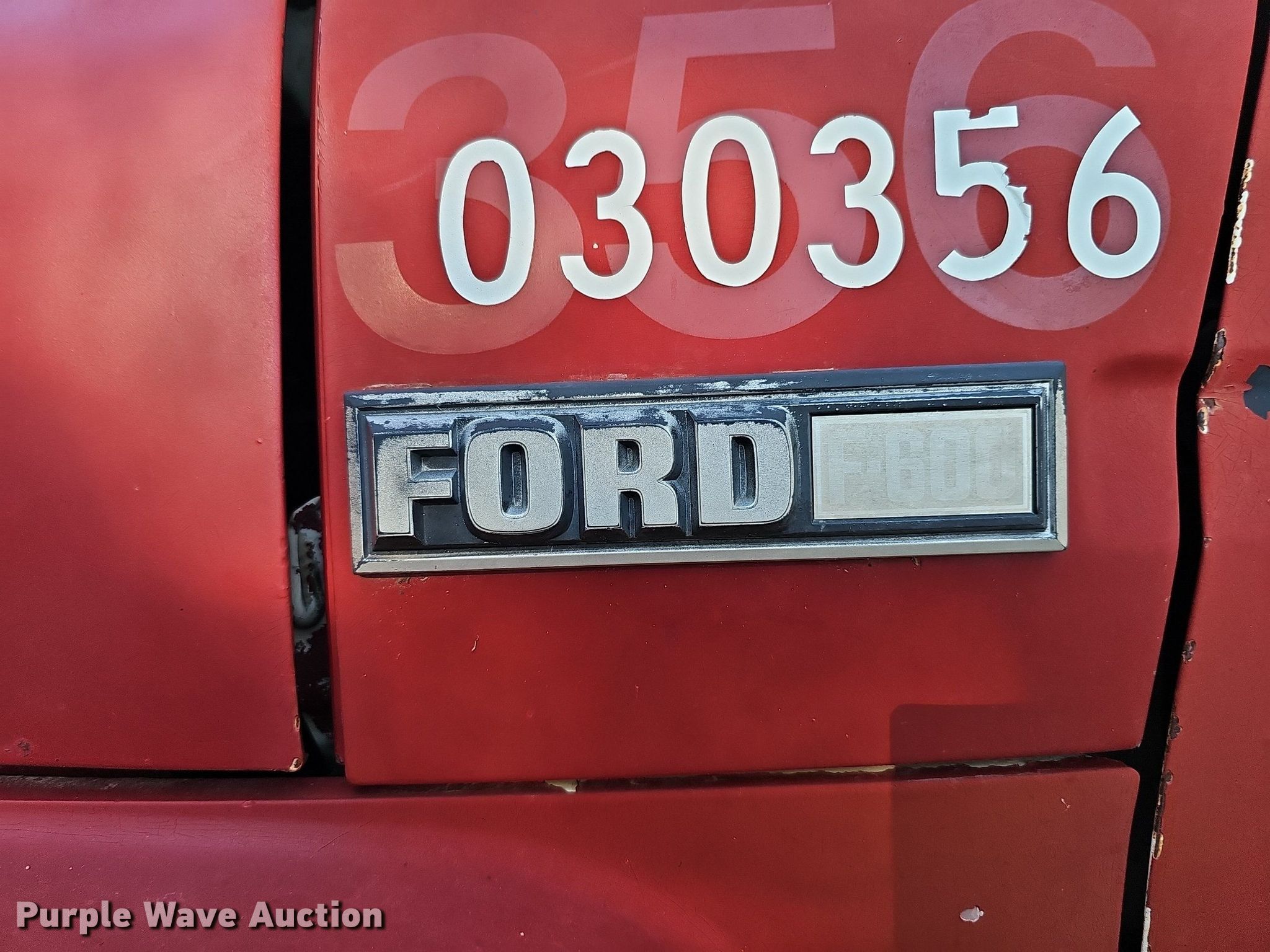 1982 Ford F600 dump truck. Miles: 36,045 on odometer, VIN: 1FDMF60H6CVA46928. Engine Displacement: 6.1L, Cylinders: 8, Fuel type: Gas. Transmission Manual, Speed: 4, plus 2. Chassis Axles: Single, Suspension: Spring, Brakes: Hydraulic, GVWR: 16,500 lbs, Wheelbase: 142". Interior Heat. Features Dump bed 9' L x 90" W, Side height: 31", Bed type: Steel, Ram: Single , End gate: Manual. Tires Size: 8.25R20. Notes Tires included, Possible engine issues, misfire. Nebraska title. Title distribution may be delayed up to 14 days from verification of funds. 1904 Nebraska 50. Weeping Water, NE 68463