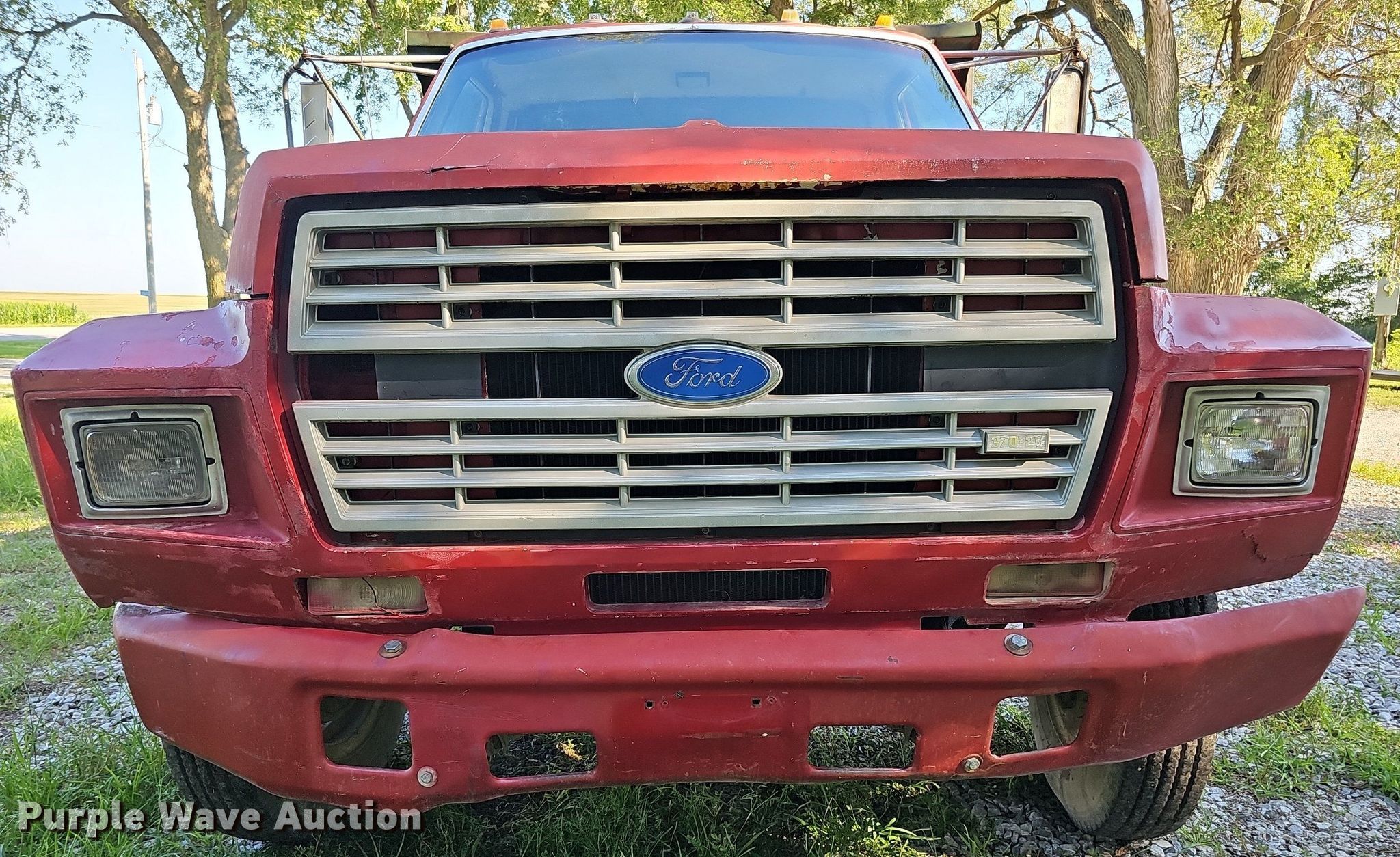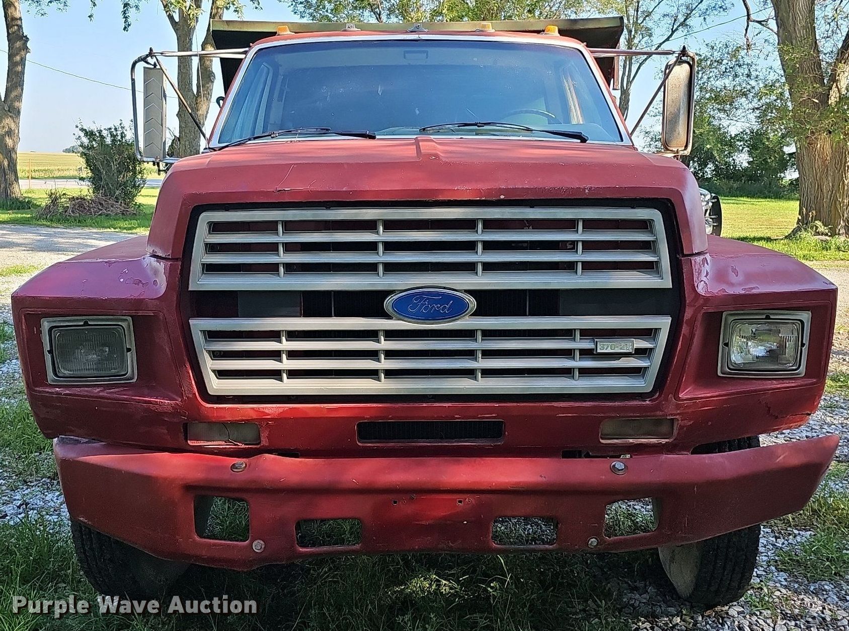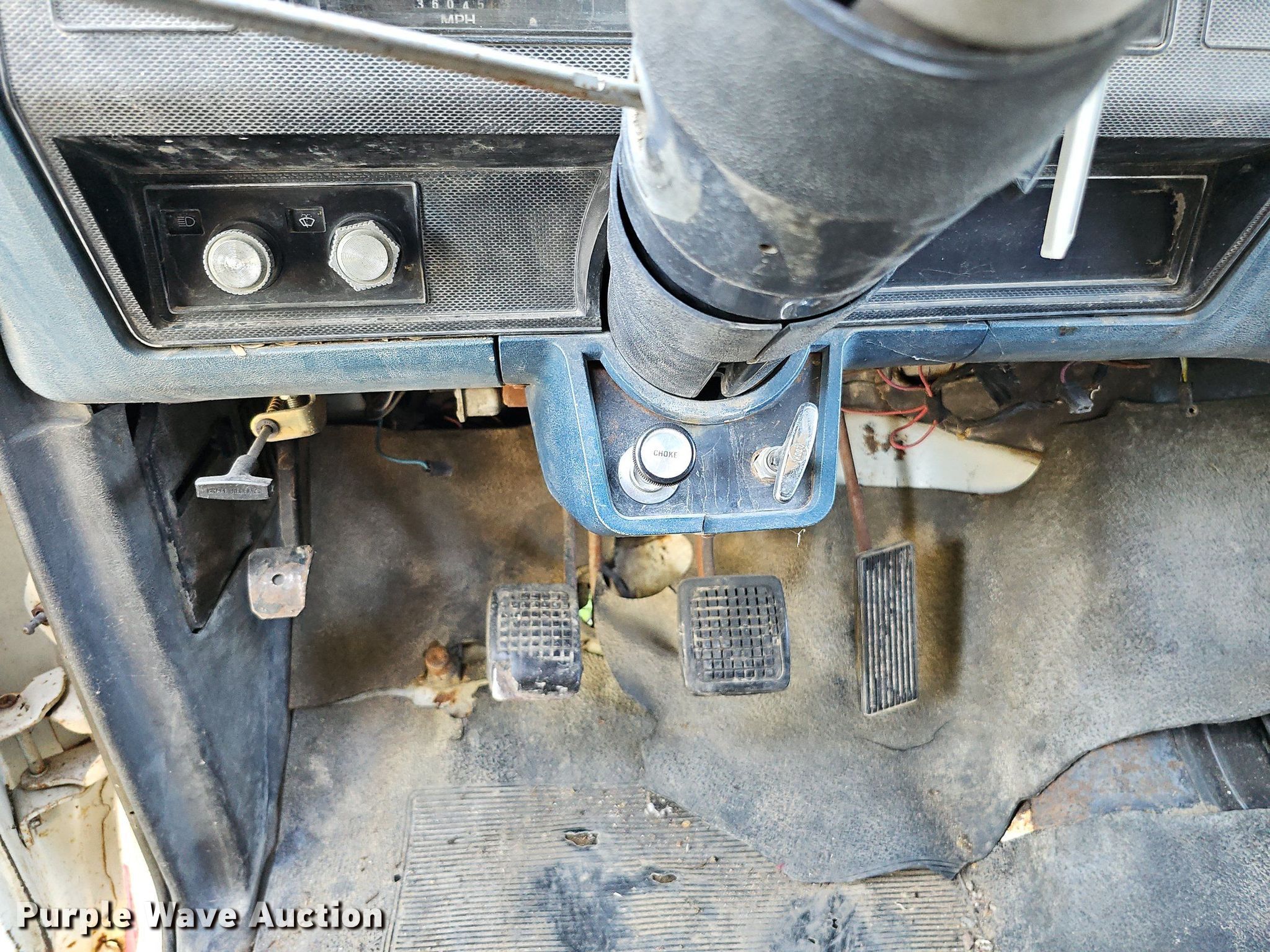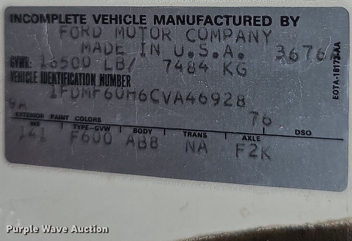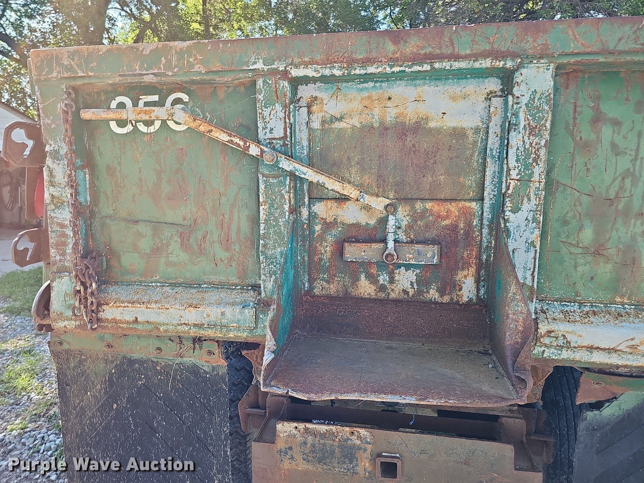 1982 Ford F600 dump truck. Miles: 36,045 on odometer, VIN: 1FDMF60H6CVA46928. Engine Displacement: 6.1L, Cylinders: 8, Fuel type: Gas. Transmission Manual, Speed: 4, plus 2. Chassis Axles: Single, Suspension: Spring, Brakes: Hydraulic, GVWR: 16,500 lbs, Wheelbase: 142". Interior Heat. Features Dump bed 9' L x 90" W, Side height: 31", Bed type: Steel, Ram: Single , End gate: Manual. Tires Size: 8.25R20. Notes Tires included, Possible engine issues, misfire. Nebraska title. Title distribution may be delayed up to 14 days from verification of funds. 1904 Nebraska 50. Weeping Water, NE 68463